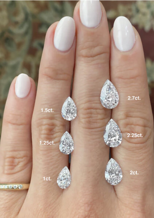 The term carat weight and size are often confused and used interchangeably. The carat number that accompanies a diamond refers to the weight, not its size. So when comparing diamonds with different carat weights, the cut can have a large impact. A high carat weight diamond with a Poor cut may look smaller than a diamond with a lesser carat weight and a Very Good cut.