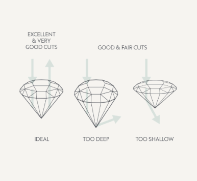 The GIA grades diamond cut on a scale of Excellent, Very Good, Good, Fair, and Poor. It is the most complex of the 4Cs to analyze because it is a subjective quality by nature and takes into account many other features of the diamond to conclude an overall grading. Note that only round diamonds get a Cut rating, because the theories behind light refraction cannot reliably predict light return of fancy shape diamonds (ie. oval, pear, marquise, emerald, radiant, etc) since every stone has a different length and width proportion.