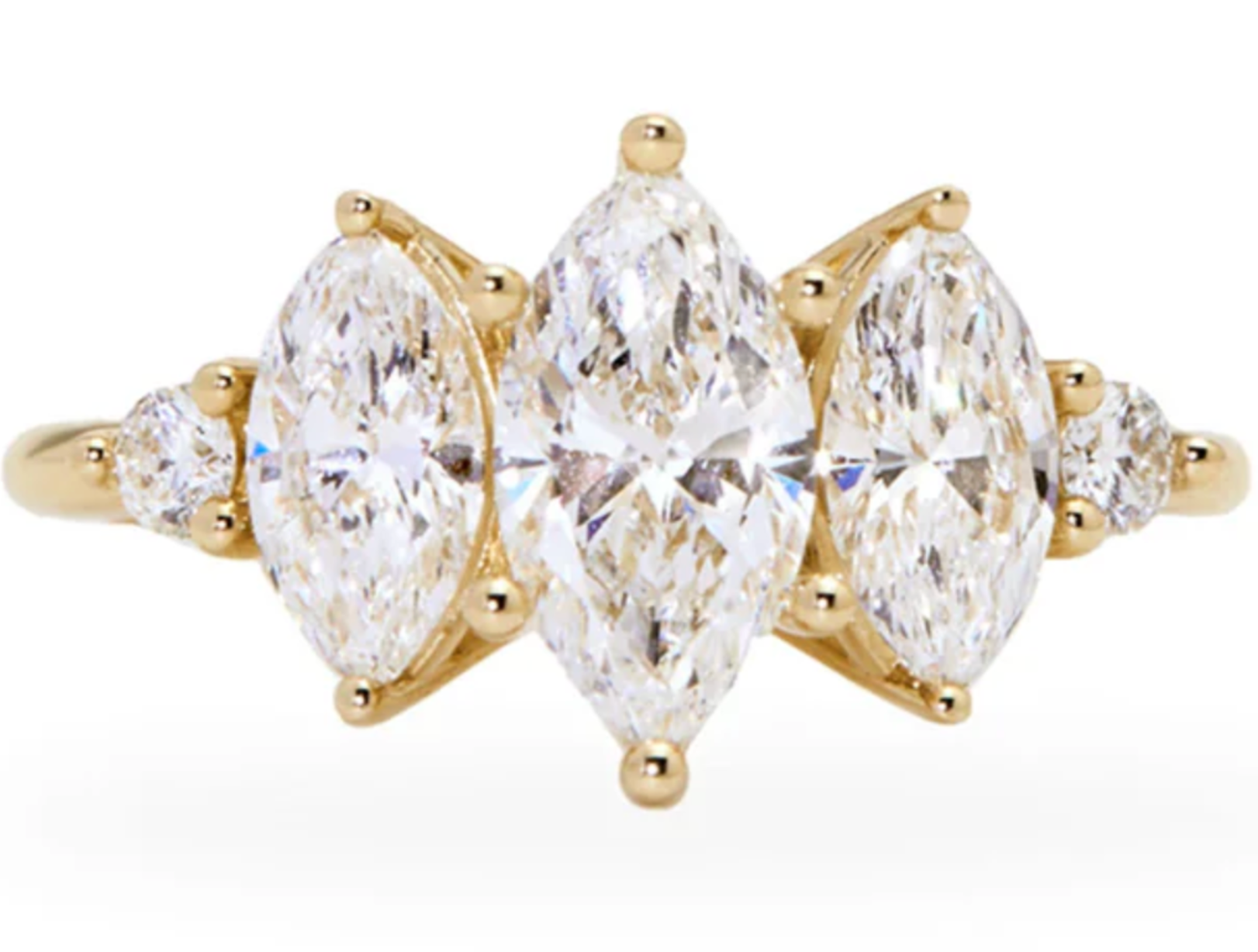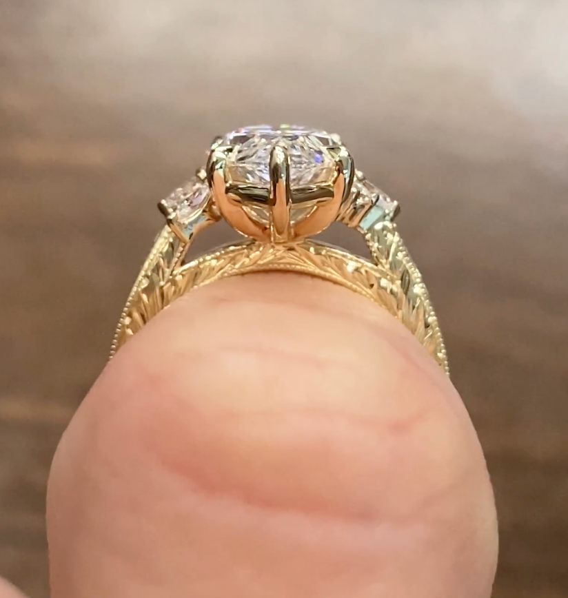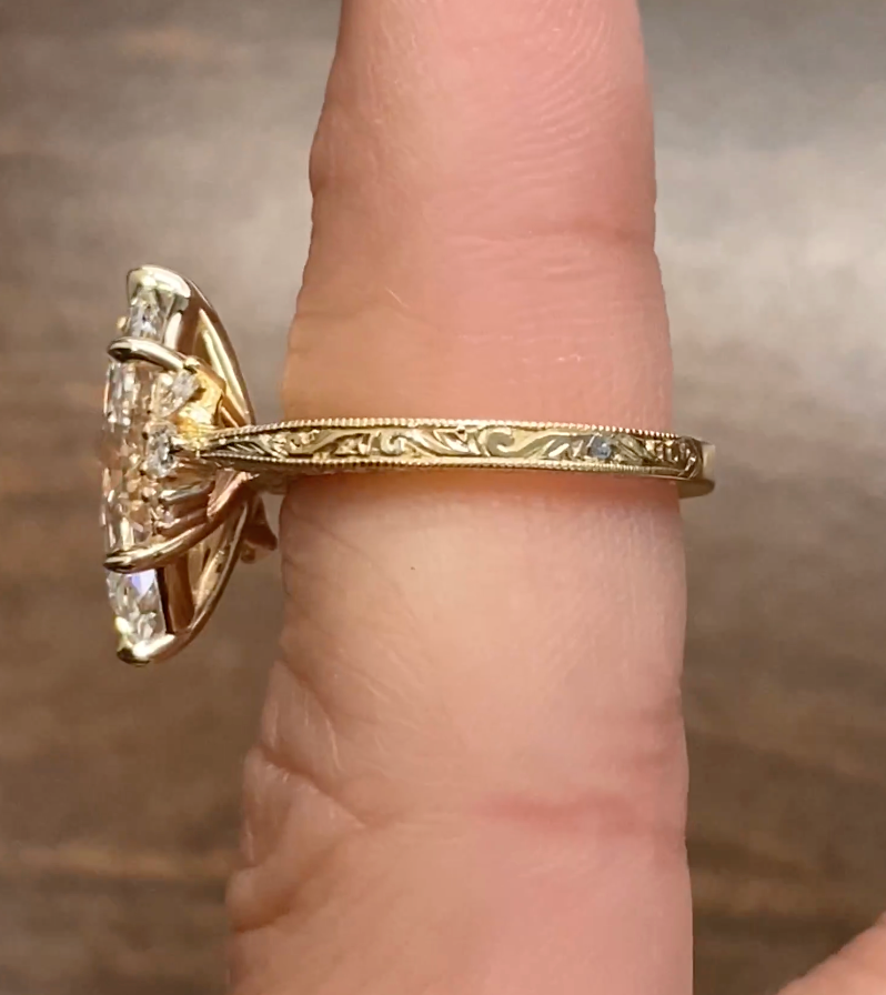 Design Details: Set with approx. 0.45ct-0.5ct LG marquise (colorless) diamonds on either side of the center, and 0.20ct-0.25ct LG rounds on the ends (photos 1&2). Reference profile height & engraved bridge of Delaney (photo 3), tapered engraved band (photo 4).