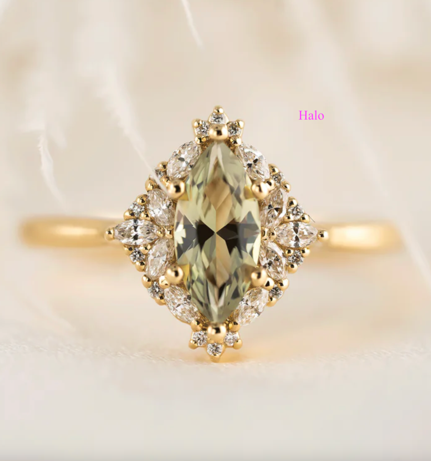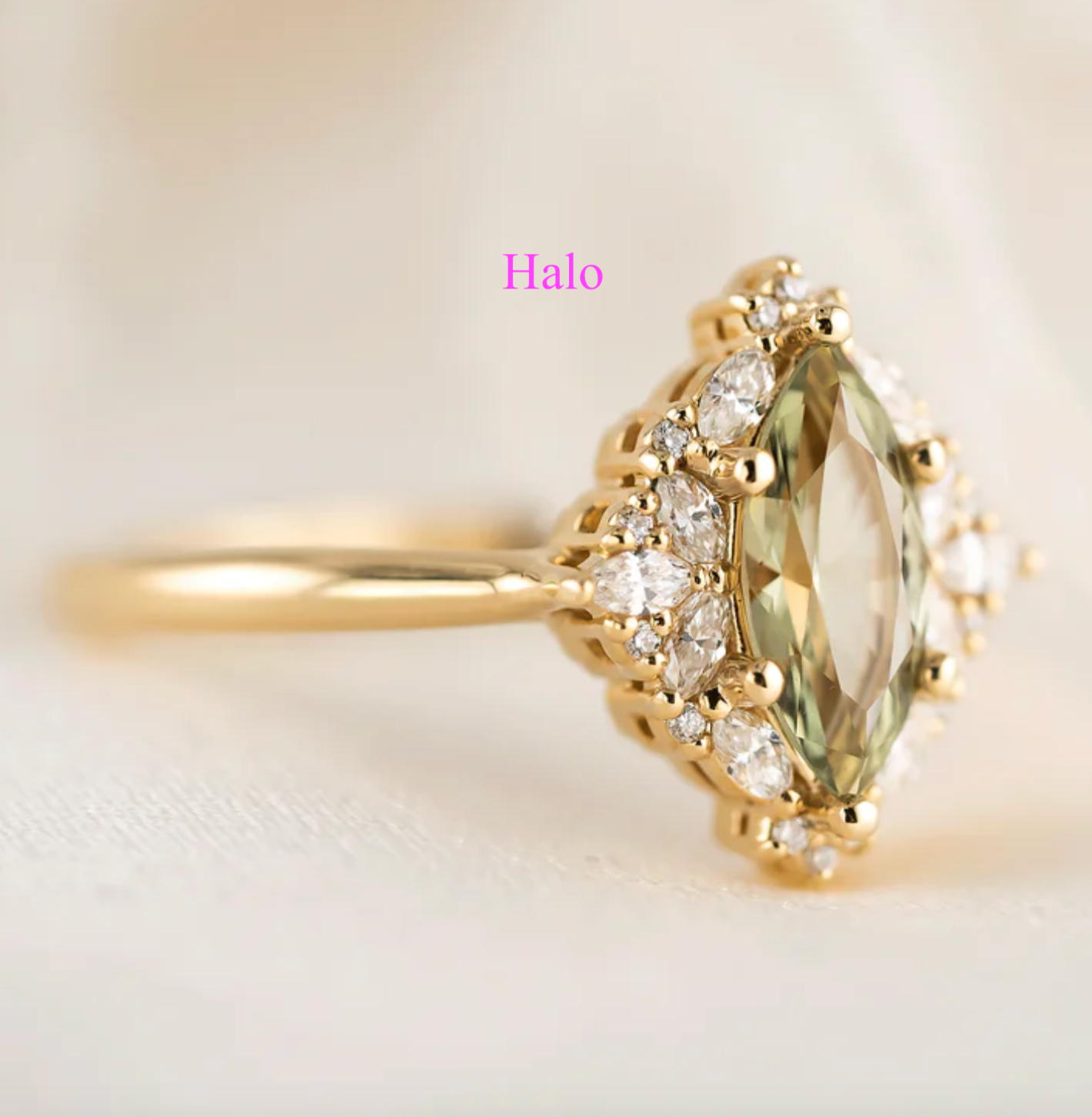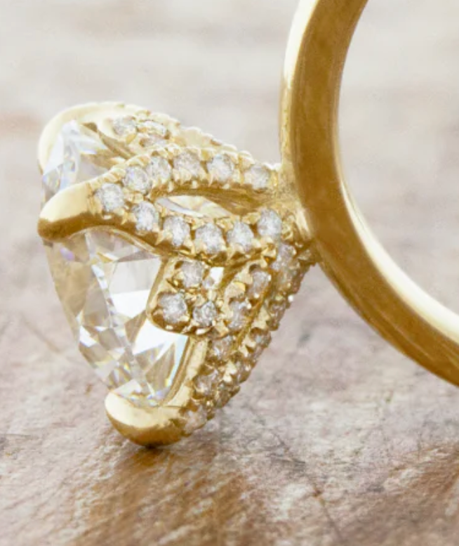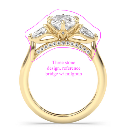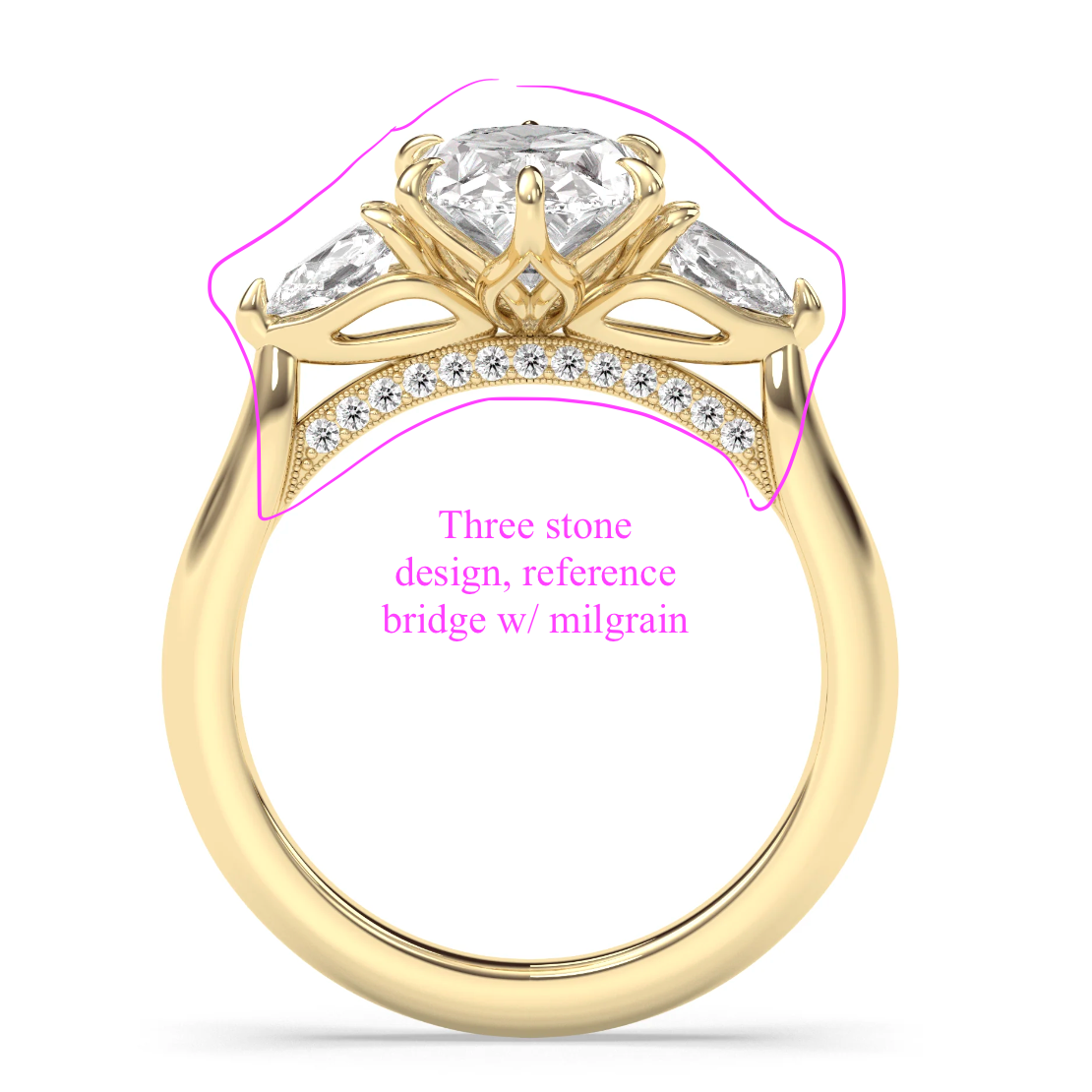 Design Details: Reference halo design (1&2). Side view as shown (3) with milgrain diamond bridge (4). Center and side stone baskets to be diamond-encrusted (5). 3.5mm flat band.