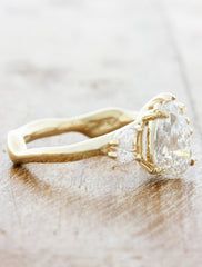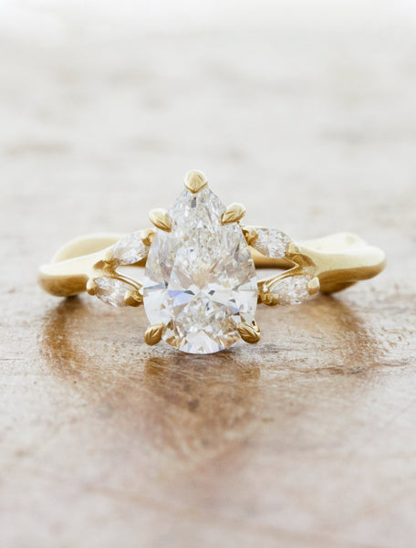The Adamaris is simply exquisite in all her nature-inspired glory.  She is created in shiny, bright 14k yellow gold. An amazing pear D VS1 diamond sits like a queen in the center of this band with a leafy hand engraved twist and stunning marquise diamonds that say hello every time you look at them.  Width of the band is approximately 1.8mm.