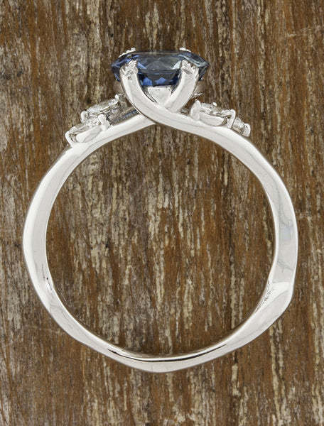 The Adamaris is simply exquisite in all her nature-inspired glory. An amazing round cut blue-green Montana Sapphire sits like a queen in the center of this band: set in a classic 4-prong setting, but with a leafy hand engraved twist and stunning marquise diamonds that say hello every time you look at them.