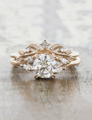 Adelina takes what we love about our Adelixa band and makes it just a bit more sparkly, with the addition of two extra diamonds. She exhibits a subtle v-shaped nature inspired leaf design like no other.  This earthy style can be worn above or below your engagement ring and is accented with three sparkling white diamonds.  Her unique details are extremely versatile and can combine with your engagement ring to make your piece stand out above all the rest. Width of band at thinnest section is 1.4mm and widest section is 3.5mm. She pairs beautifully with the Pembroke and Adelia