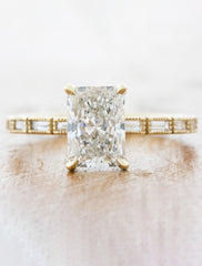 Afrik is a unique, Art Deco inspired design that holds a gorgeous radiant cut center diamond with old world baguette diamonds on the band.  The result is a decidedly modern look with a twist of vintage flair.