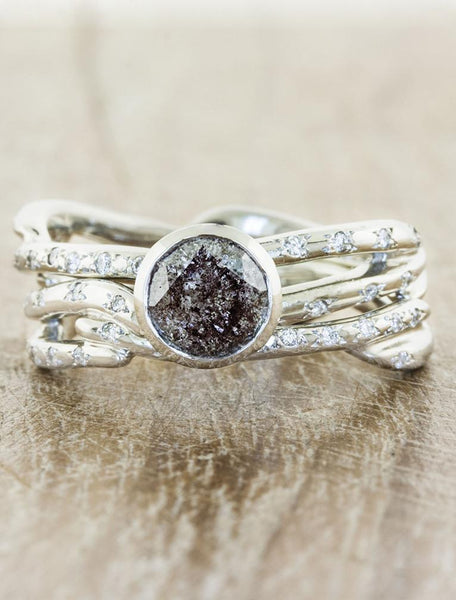 Organic and sculptural, the Amani ring features a gracefully split band sprinkled with glimmering diamonds, centering a round salt and pepper diamond in a protective bezel setting - an artful balance of nature’s raw elegance and refined design.