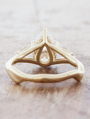 Aria is simply exquisite in all her nature-inspired glory. A pear diamond takes the spotlight hugged by leaf engraved prongs. For even more sparkle, her organic band splits with marquise accents and a hidden halo is tucked under her center stone.