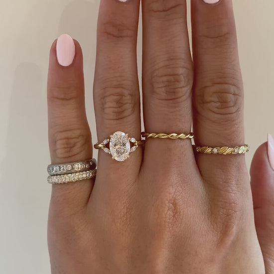 Aria is simply exquisite in all her nature-inspired glory. An oval diamond takes the spotlight hugged by leaf engraved prongs. For even more sparkle, her organic band splits with marquise accents and a hidden halo is tucked under her center stone.