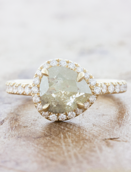 Audrix is different - something simple, sweet, organic and elegant all rolled into one. Her heart is set with a wondrous 1.19ct rustic pear diamond set in an east-west orientation to capture your attention. The 14k yellow gold setting has a pavè band and diamond halo for extra sparkle.