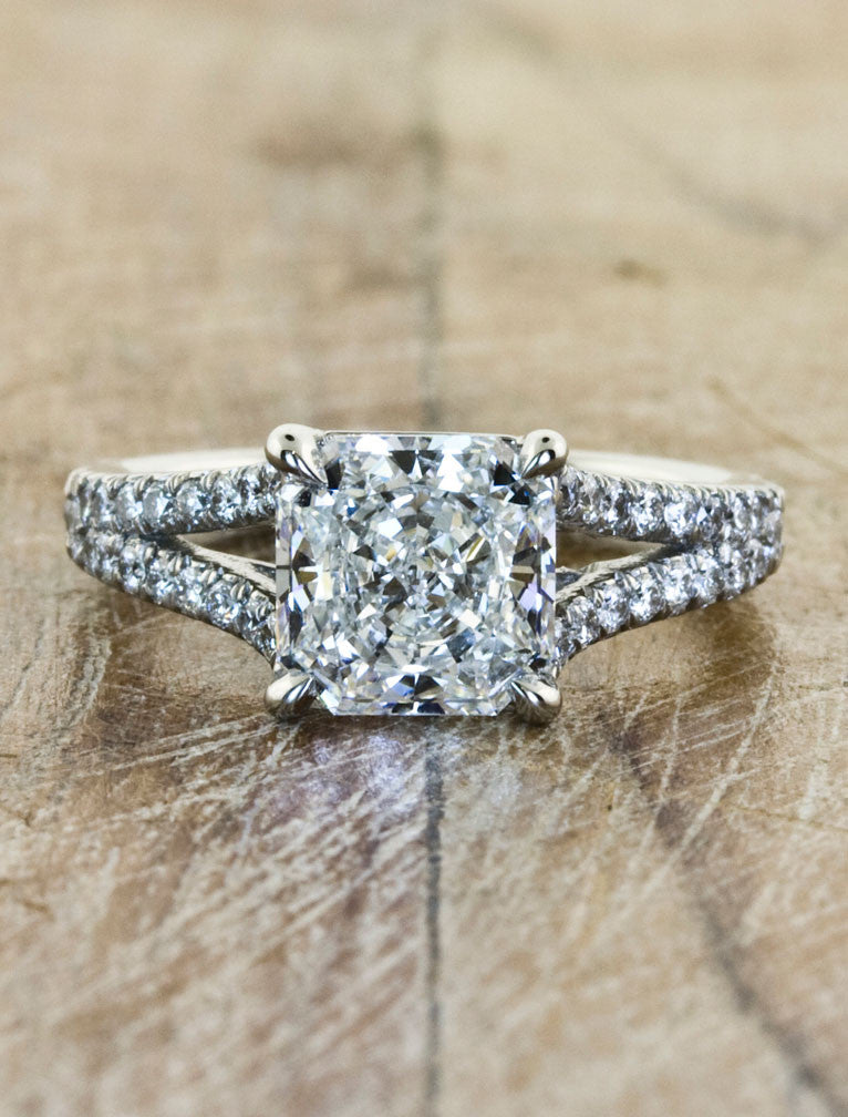 We sourced a breathtaking radiant cut diamond for a client and set it on a platinum diamond-accented double arching band.  Yet another unique and timeless piece by KDD.