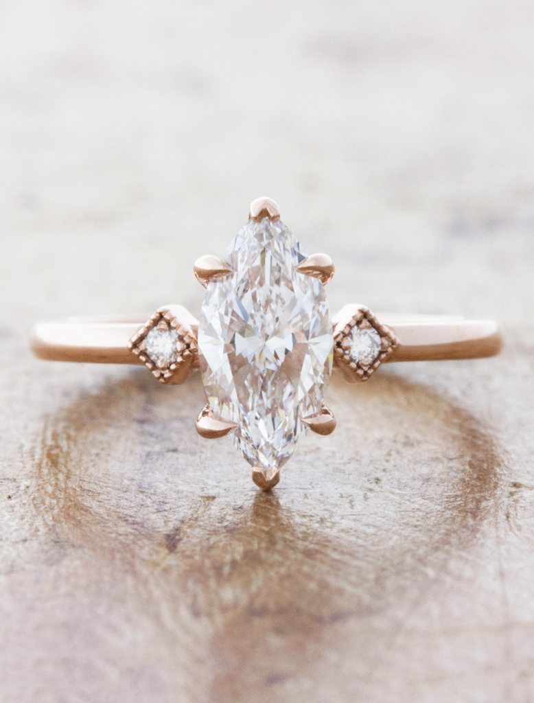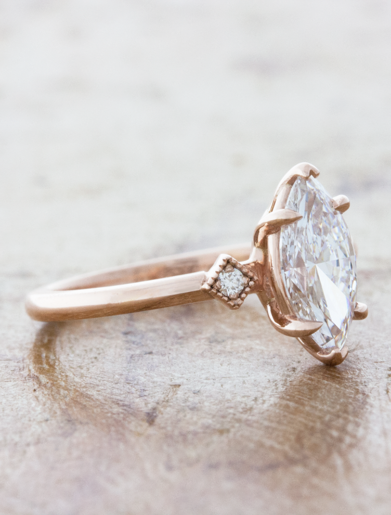 Bianca is a work of love and art. Her 14k rose gold setting oozes vintage flair that is hard to resist. She holds a bright 1.01ct D color VVS2 clarity marquise diamond in a vertical position that commands attention.  The marquise is nestled in between two white diamond accents that act as her companion much like her future partner will forever and ever.