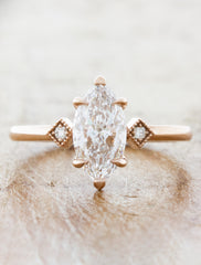 Bianca is a work of love and art.  Her 14k rose gold setting oozes vintage flair that is hard to resist. She holds a bright 1.12ct D color VVS2 clarity marquise diamond in a vertical position that commands attention.  The marquise is nestled in between two white diamond accents that act as her companion much like her future partner will forever and ever.