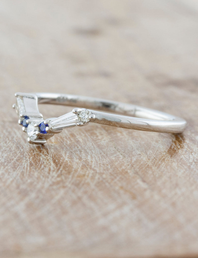 Bleu is the throne for your queen.  She features an elegantly contoured band with a collection of sapphires and diamonds of different shapes. Paired beautifully with our Constance. Handmade in NYC.
