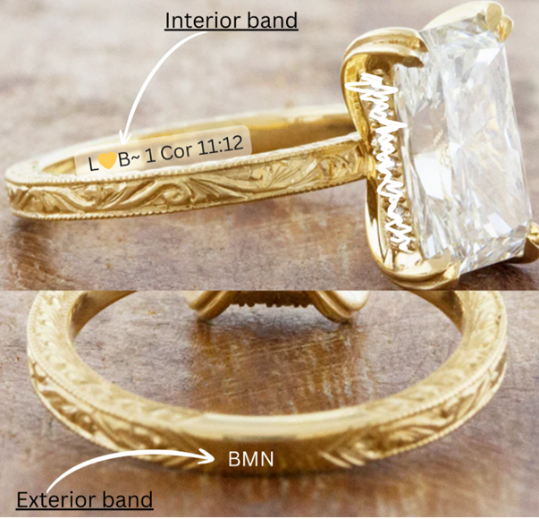 - interior engraving ( L♡B~ 1 Cor 11:12) + exterior engraving on the sizing bar (BMN) all TNR. Agreed on re-engraving if resizing is needed.