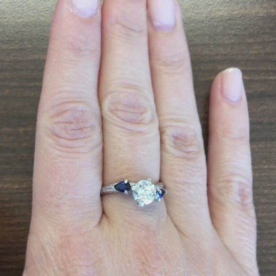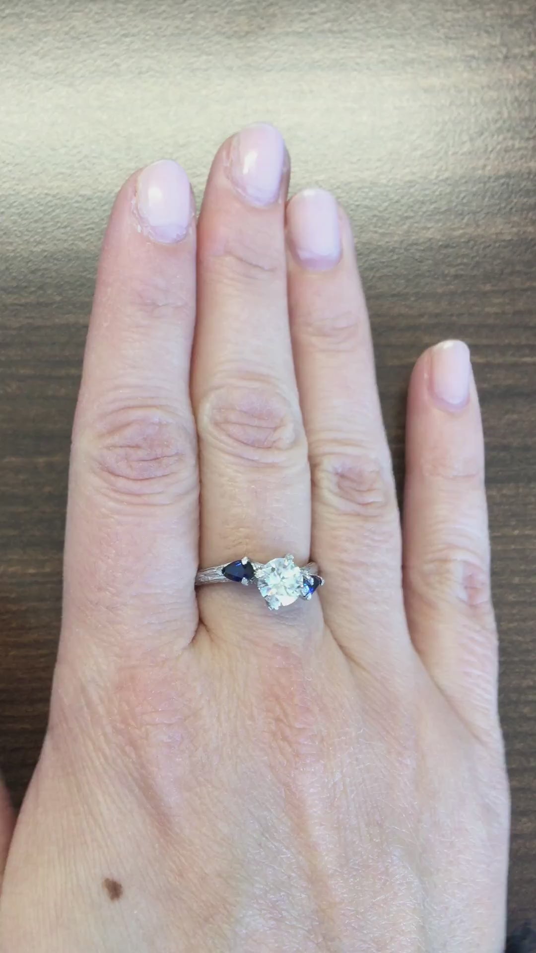 Inspired by our Aurora Three Stone, Bueti is our sculptural take on a traditional three-stone engagement ring. It features a unique wave-like band that flows into striking pear cut blue sapphire stones to complement her round cut diamond heart. Along the band is hand-engraved bark texture for added organic flair.