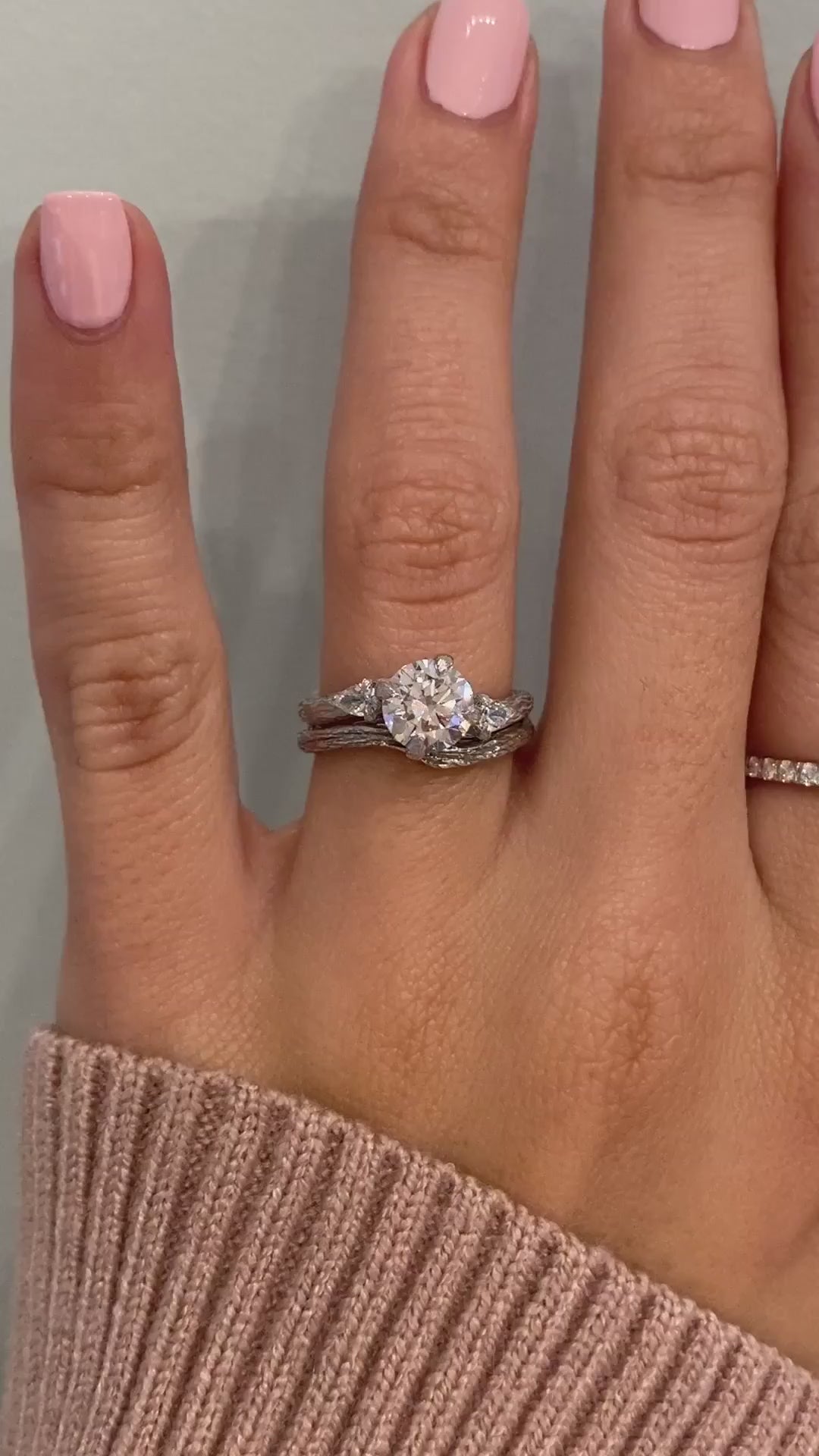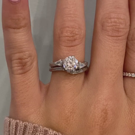 Organic three-stone engagement ring with pear side stones