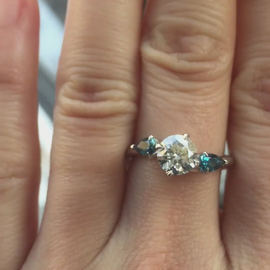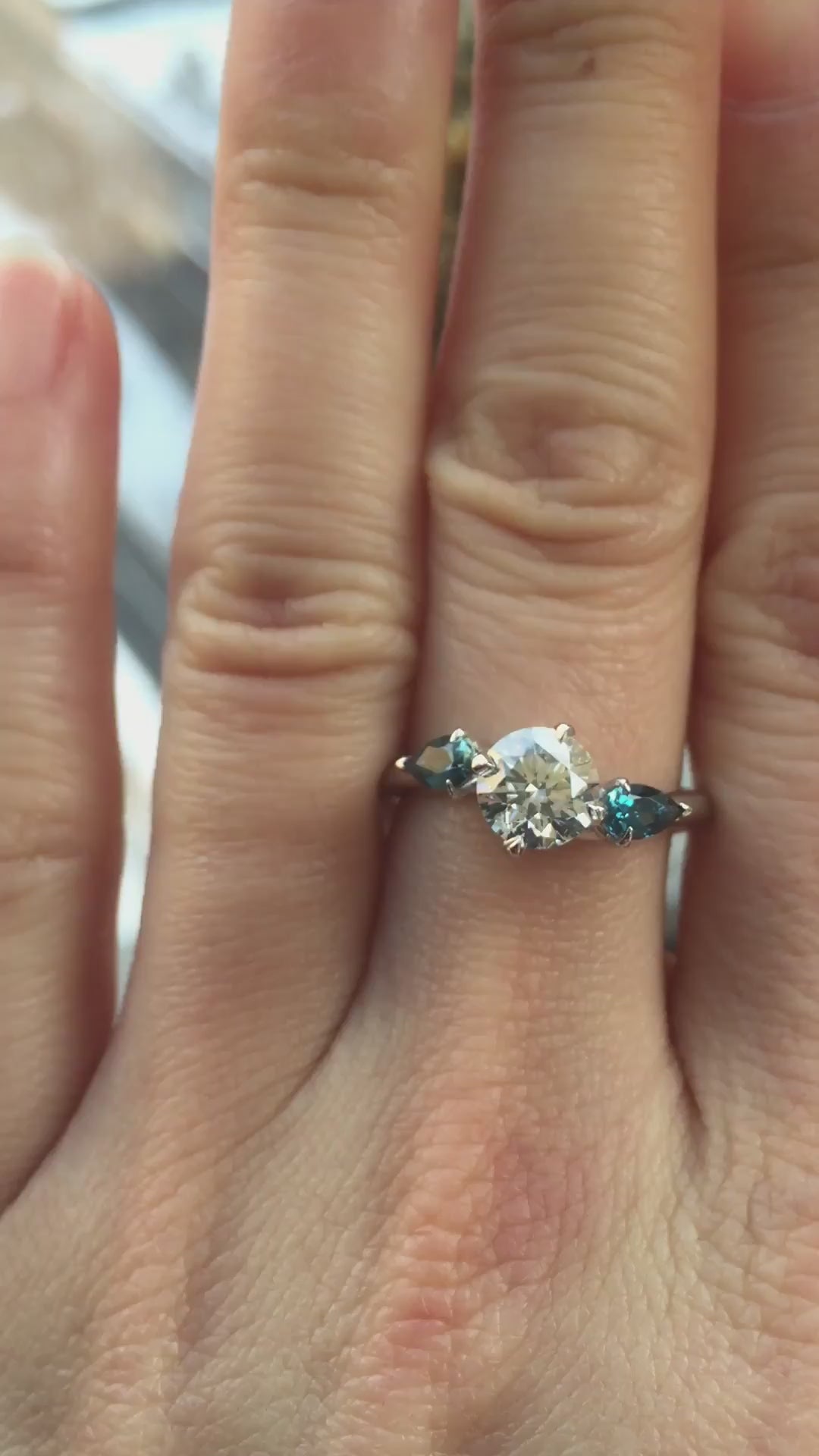 Inspired by our Aurora Three Stone, Bueti is our sculptural take on a traditional three-stone engagement ring. It features a unique wave-like band that flows into striking blue sapphire pear side stones to complement her round cut diamond heart.