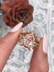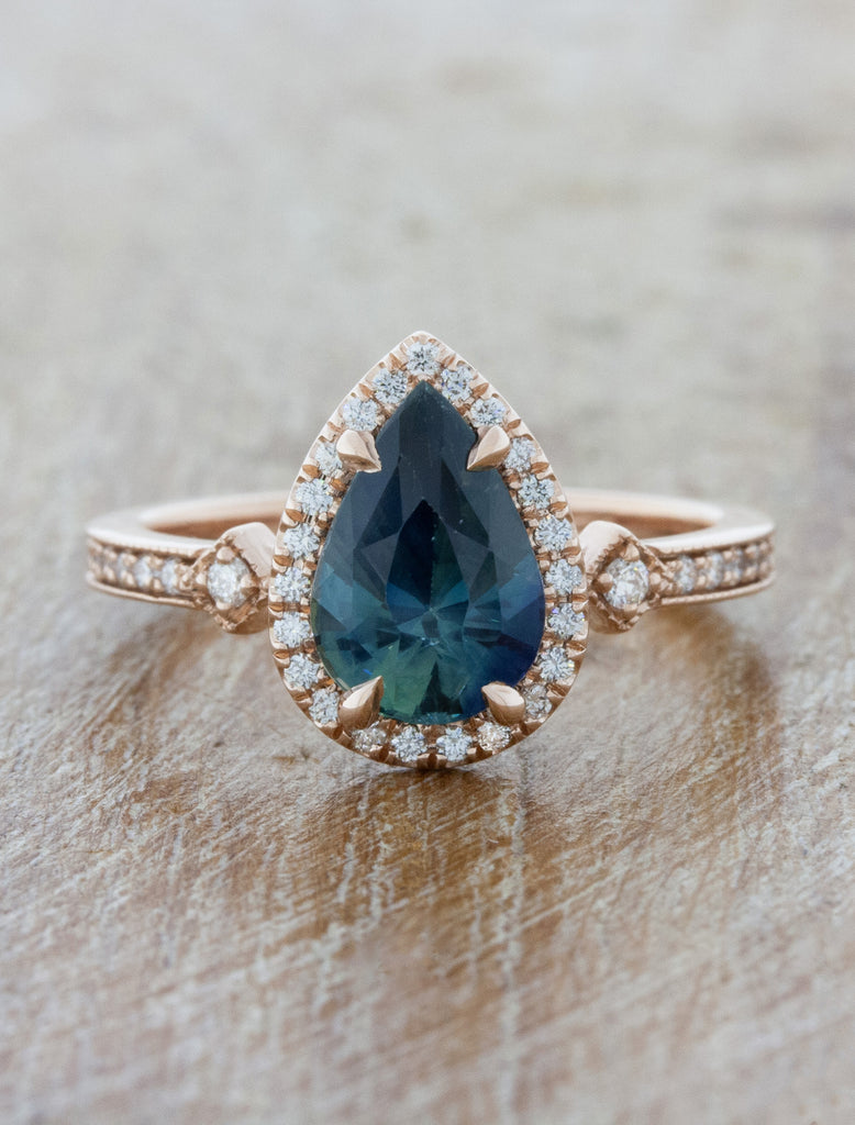 Calandra is a work of love and art made in 14k rose gold.  She oozes vintage flair that is hard to resist. She holds a glorious pear sapphire surrounded by a diamond halo that commands attention because of her unique position and vibrant color.  The center stone is nestled in between 0.18tcw of brilliant round white diamonds that act as her companion much like her future partner will forever and ever.