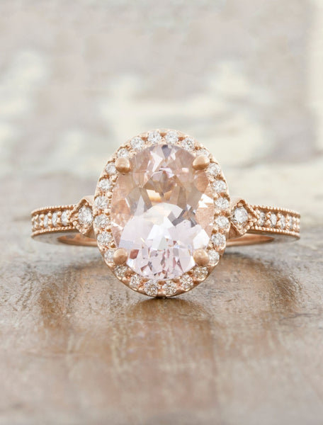A matching wedding set featuring our Calandra - a vintage inspired oval Morganite rose gold engagement ring with a diamond halo.