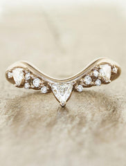 She's paired with our Tempest, an intricate contoured wedding band with trillion and round shaped diamonds.