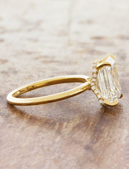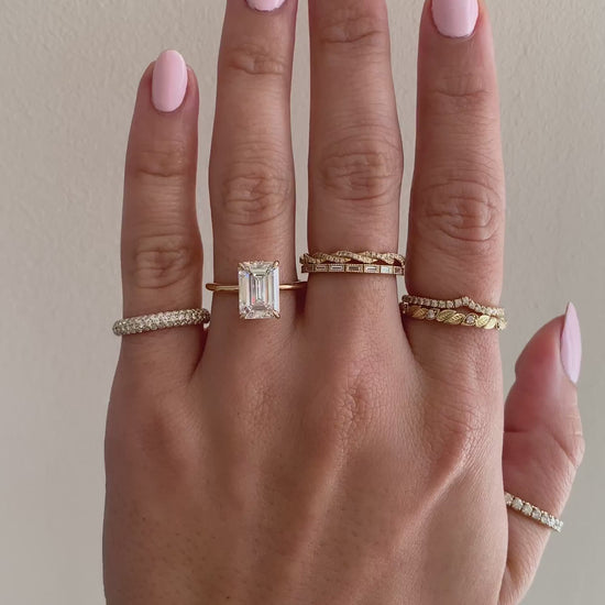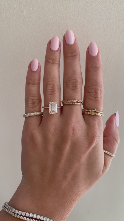 Calista features a stunning emerald cut diamond, showcasing its refined beauty and timeless elegance. Set in a band with diamond-encrusted prongs and hidden diamond under the basket, this design combines chic simplicity with a touch of sparkle, creating a modern yet classic symbol of love.