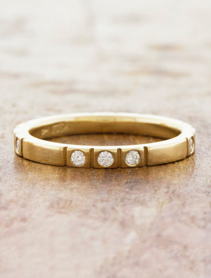 Casey is a sleek 2mm flat band with squared-off edges, embodying a minimalist, modern aesthetic. Scattered round diamond accents add a touch of subtle sparkle, creating a striking, stackable design.