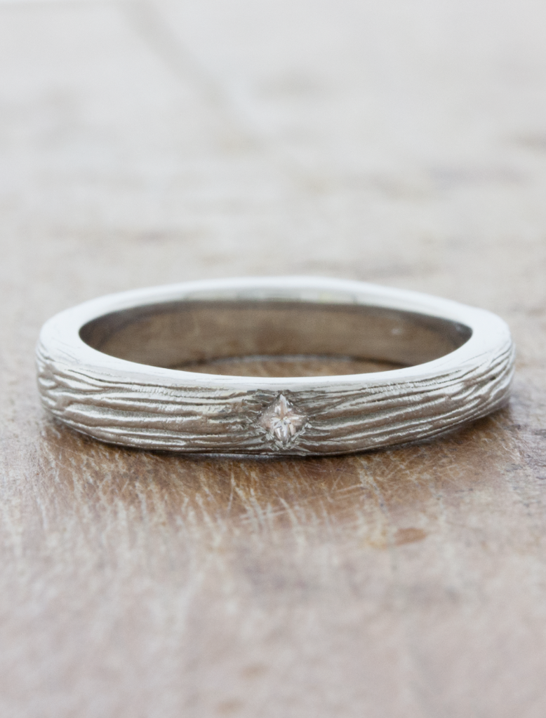 Bark textured wedding band with diamond accent