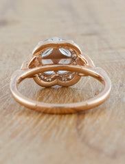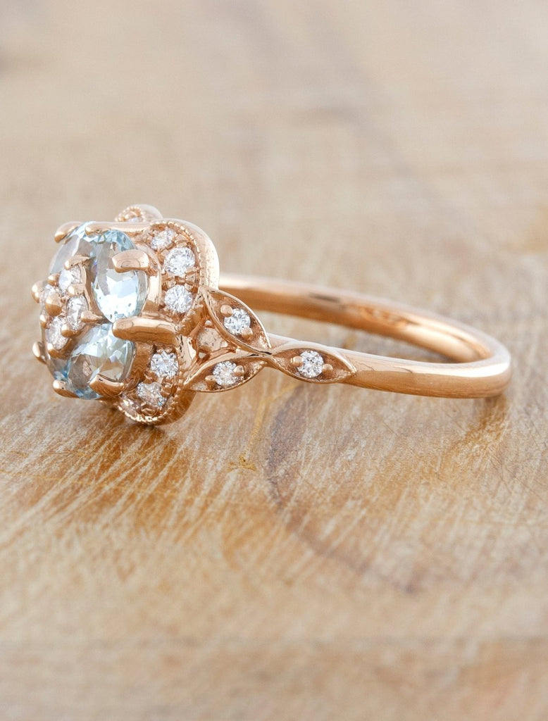 With inspiration from our Chloe and Rachael designs, Clara just draws you in. Her look makes us think of an art-deco style tulip. Finely crafted in 14k rose gold and accented with sparkly white diamonds, her design makes us think of an art-deco-style tulip.  She is set with beautiful, oval shaped aquamarines. Perfect as an unconventional engagement ring with artistic flourishes.