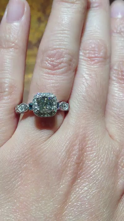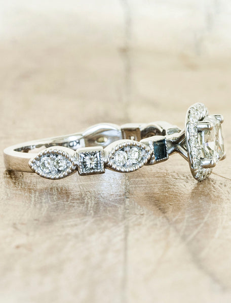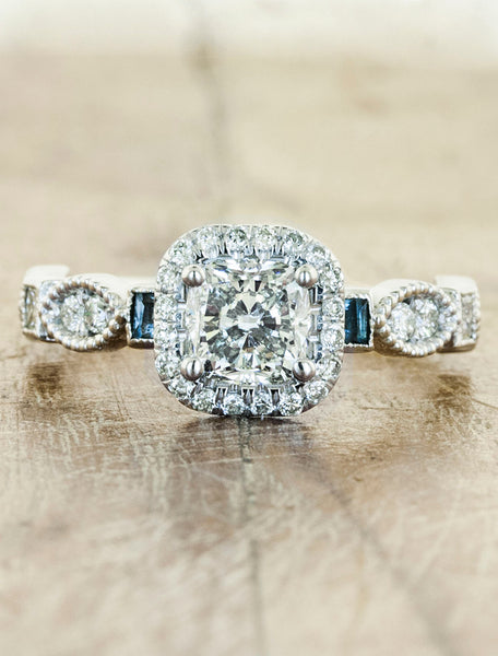 This sweet couple had many ideas, and through several sessions and some of this groom's artistic talent, we created the Fanny.  Her heart is the 1.00ct Cushion Cut Diamond surrounded by a halo of more sparkling diamonds and two beautiful, blue topaz stones that complete this pretty picture.  For some vintage flare, the band is covered with even more diamonds halfway around in a cool arrangement with trimming and some handmade bead work.  Fanny is just as beautiful as her bride to be:)