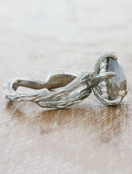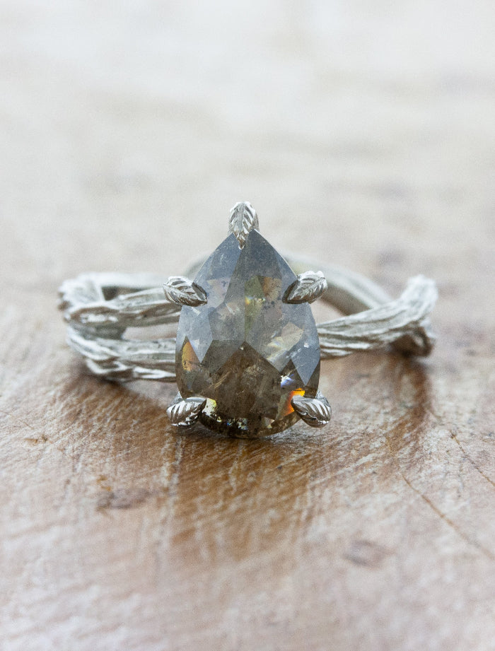 Cyrus features a split shank band, symbolizing the merging of two paths into one destiny.  A captivating salt and pepper pear diamond sits atop the bark textured band secured with hand-engraved leaflike prongs.  Brilliant white diamonds are sprinkled along the ring's gallery for an added pop of sparkle.
