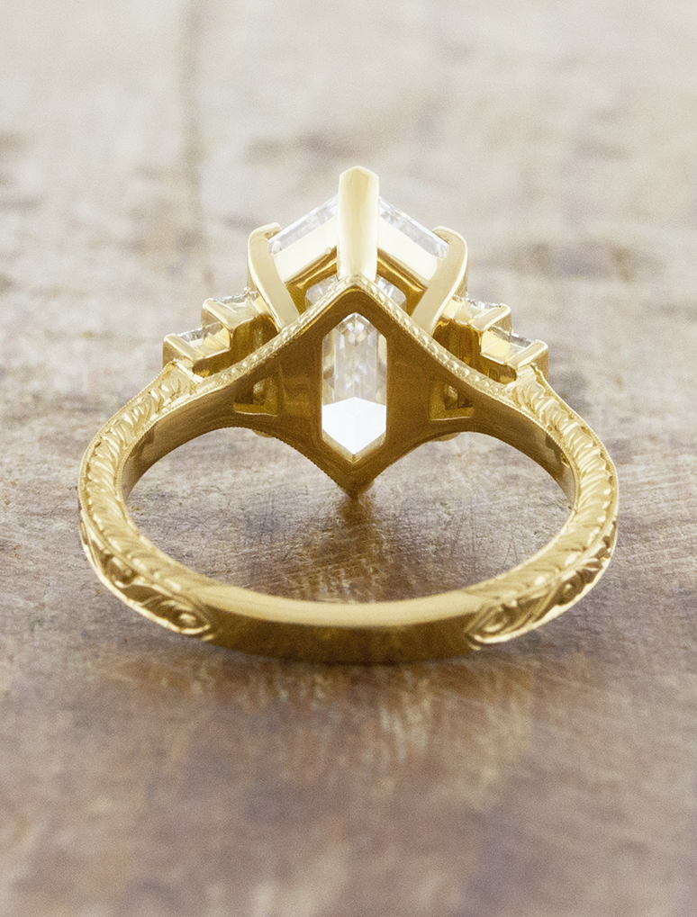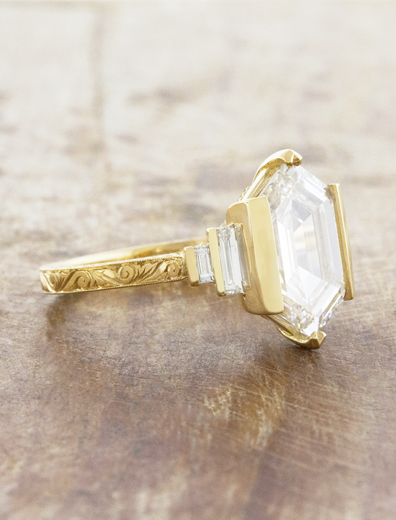 Decca is an Art Deco inspired engagement ring featuring a striking step cut hexagon diamond in a semi-bezel setting. On either side, baguette diamonds stand at attention tapering into the intricate hand-engraved band. With its geometric lines and bold symmetry, this design blends timeless glamour with old world artistry.