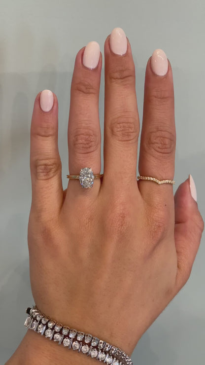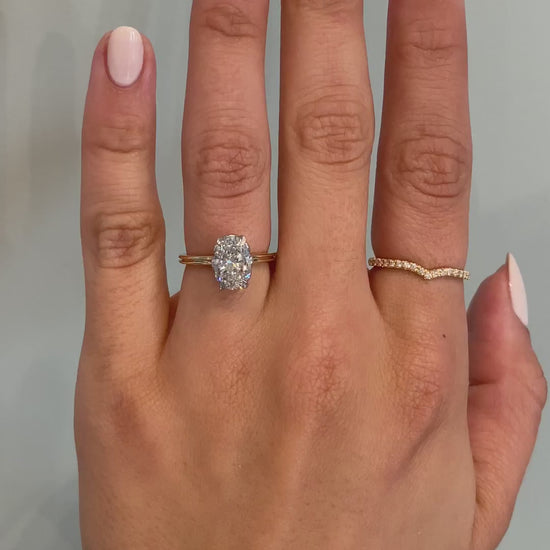 Decorah features a unique double band and an ornate basket, thoughtfully sprinkled with brilliant white diamonds.  Her gorgeous center diamond is held in place by four handcrafted leaf-like prongs.  You can't take your eyes off this beauty.  Available in single color or mixed metal.