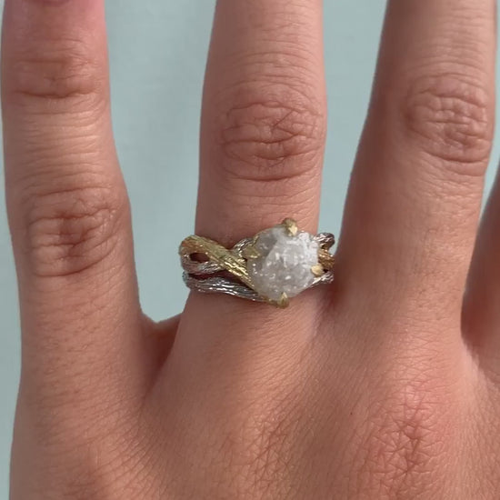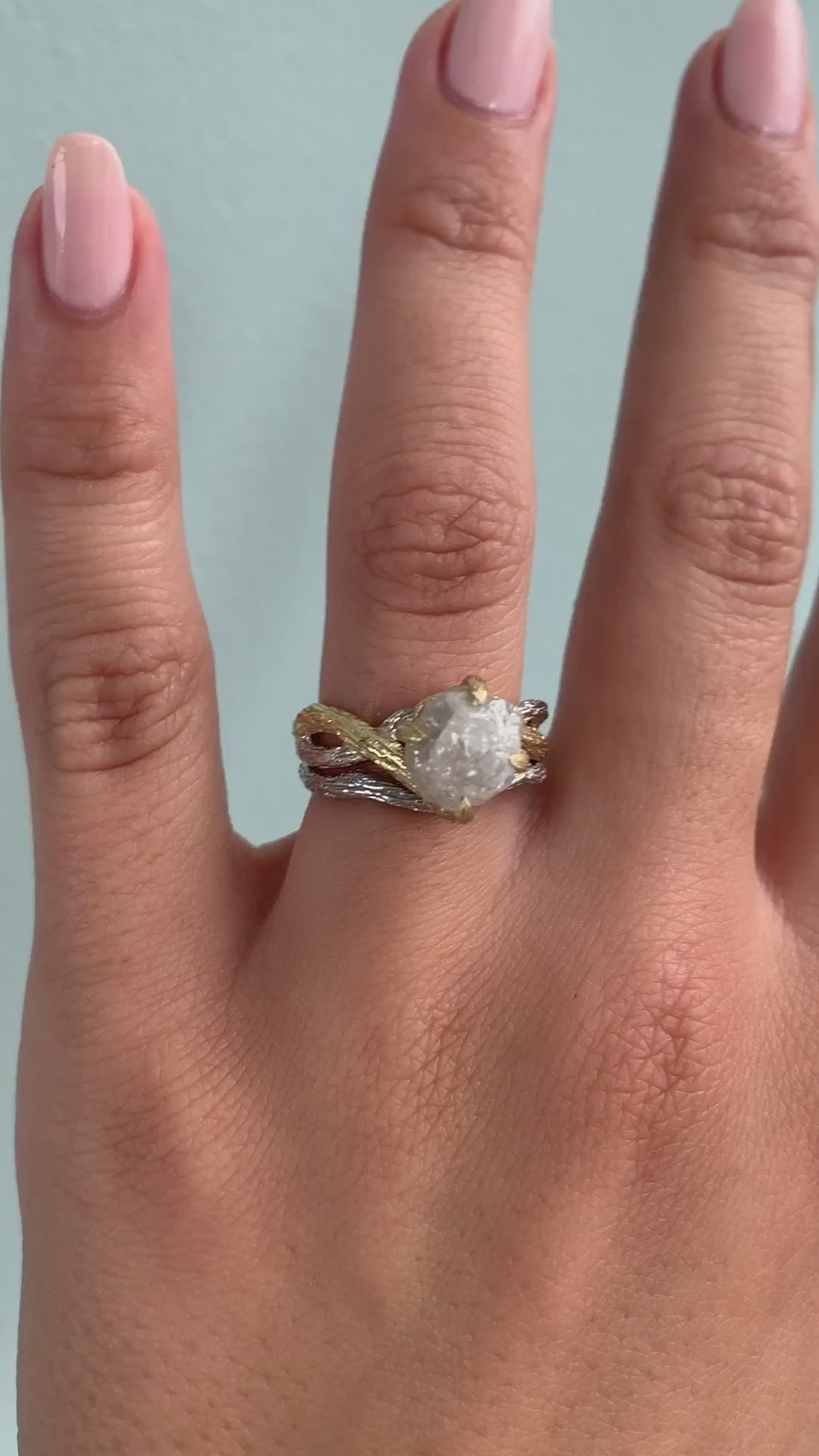 Diemis combines sculpture and symbolism. She features a split shank, symbolizing the continual merging of two paths during this life long journey of love.  Its unique wave-like band elegantly contours the finger.  A cool rough diamond sits atop a recycled metal band of your choosing in a classic 4-prong setting. Handmade in NYC.
