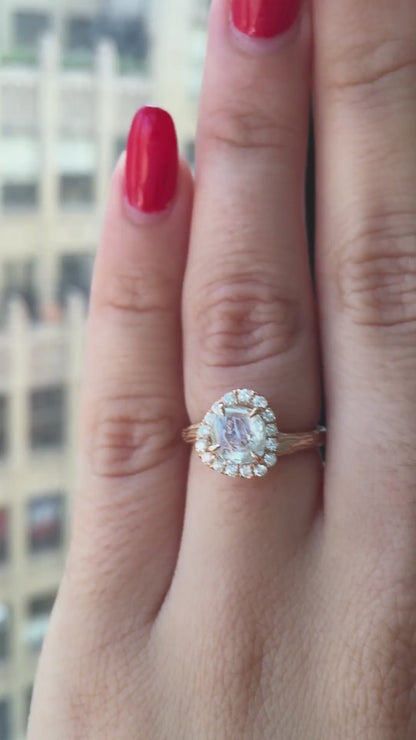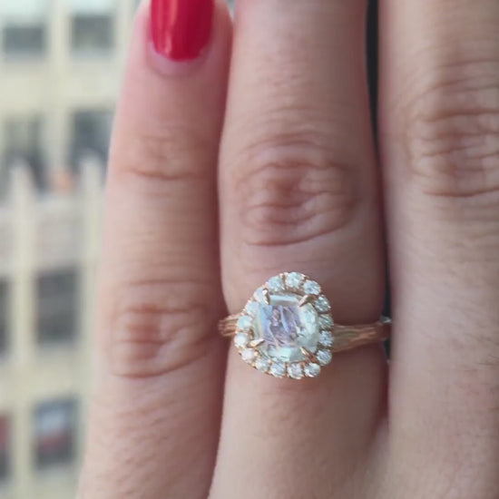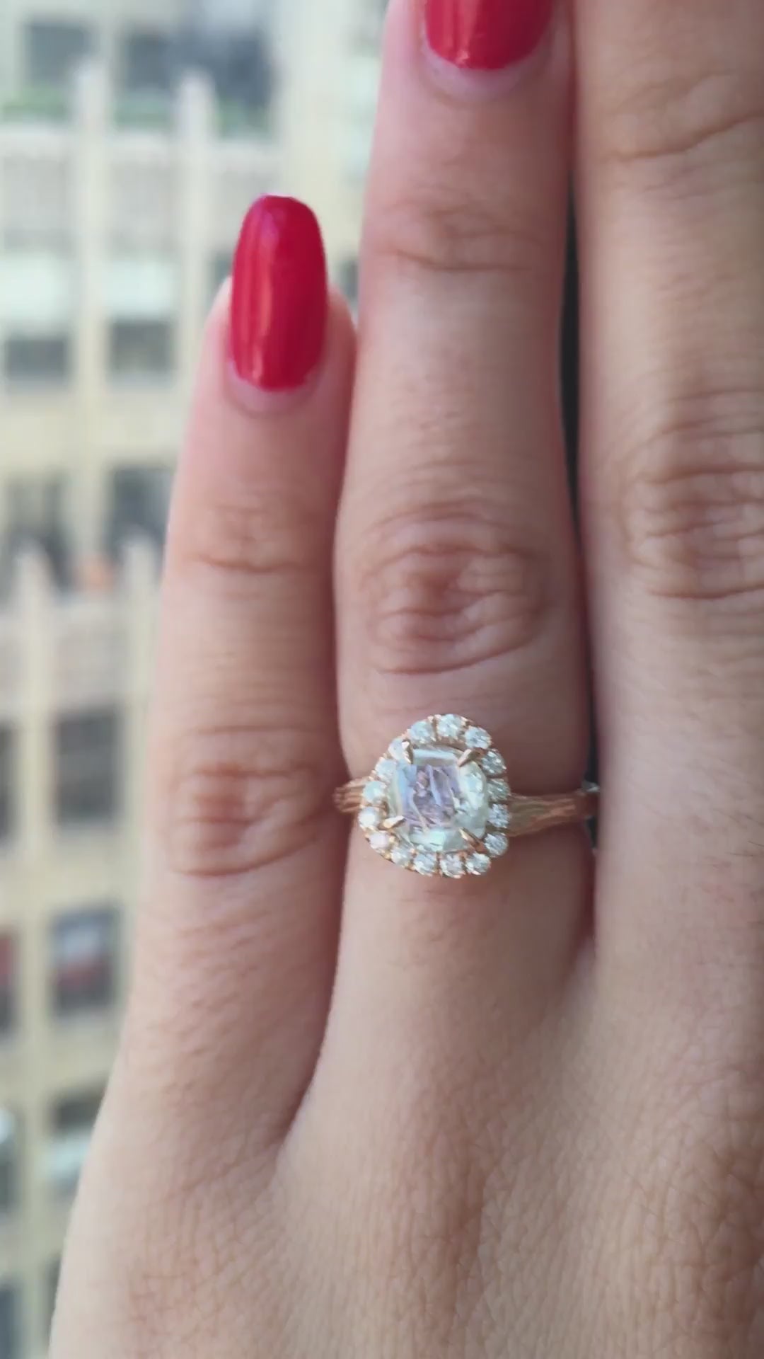 Meet Elaina — an elegant twist on a timeless classic. This halo solitaire engagement ring features a shimmering round diamond encircled by a delicate diamond halo, set atop an asymmetrical band with organic bark-like texture for a nature-inspired, uniquely romantic touch.