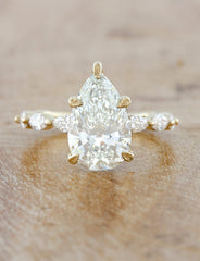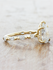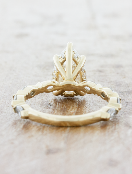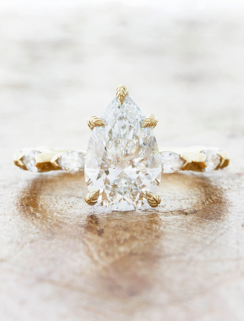 Inspired by our Carissa design, Elaine is a pear cut D VVS2 diamond engagement ring featuring a hidden halo and a delicate band with marquise shape diamonds.  Our signature leaf detailing is carved into the center stone prongs. Band width measures approx 2.2mm.