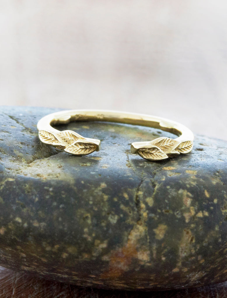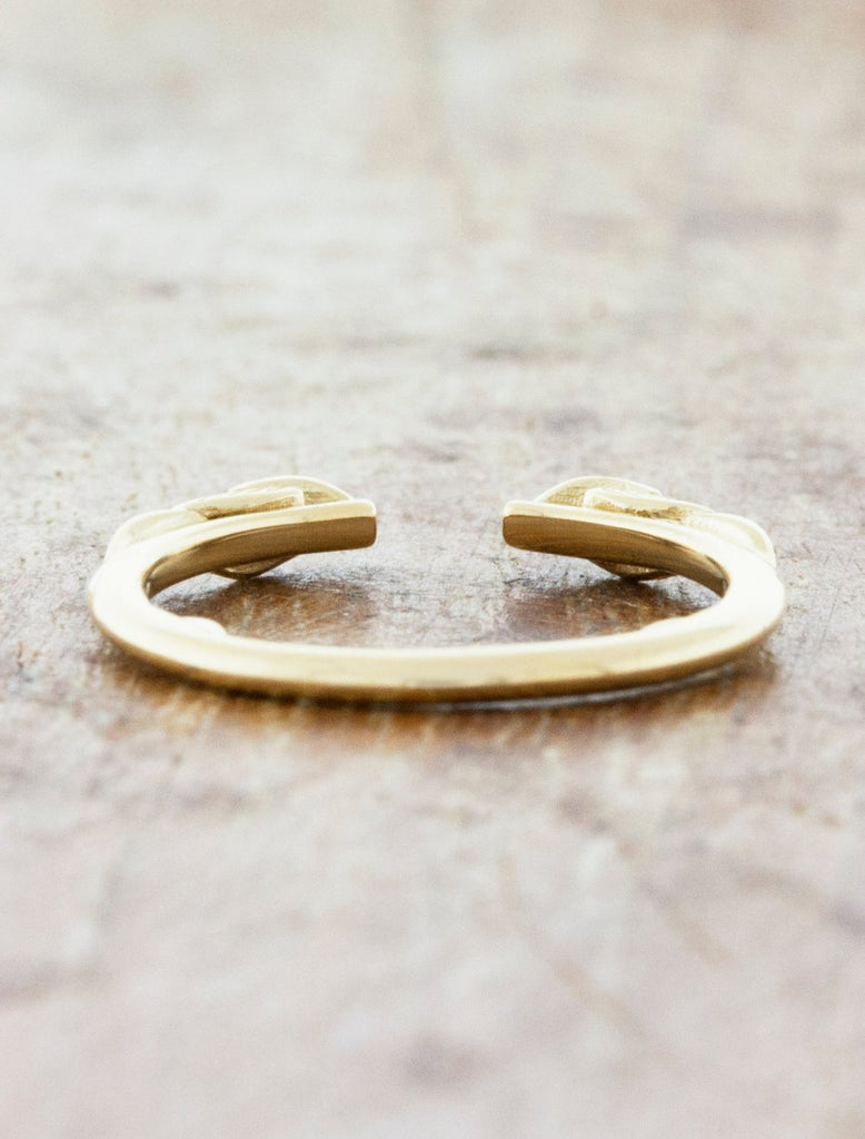This cuff-style ring is adorned with enchanting leaf-engraved accents, adding a touch of nature's beauty to your love story. Elo is the perfect companion for your engagement ring, especially a low profile setting, that effortlessly stacks to create a harmonious and elegant union.