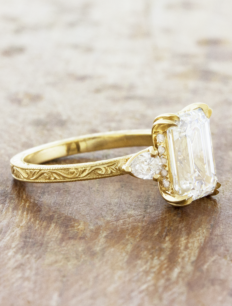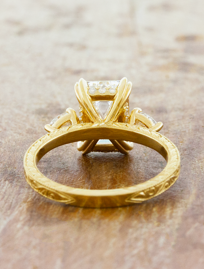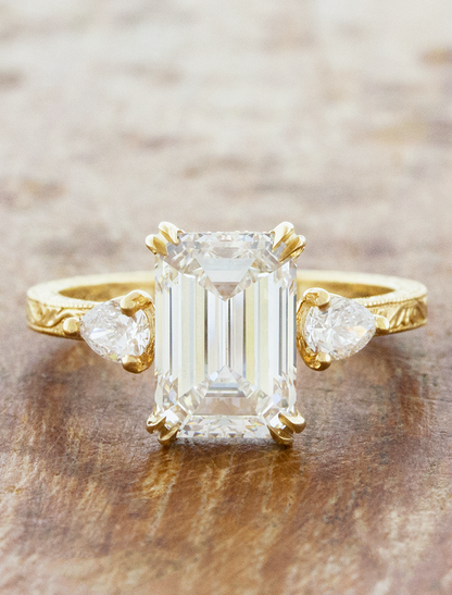 Esperanza is an elevated, vintage inspired three-stone that captures the essence of timeless romance. This piece features a breathtaking emerald cut diamond hugged by a hidden halo and double prongs set in between two pear shaped side stones. The band showcases intricate hand-engraved regal details, reminiscent of vintage artistry, ensuring that each glance reveals a new layer of beauty.