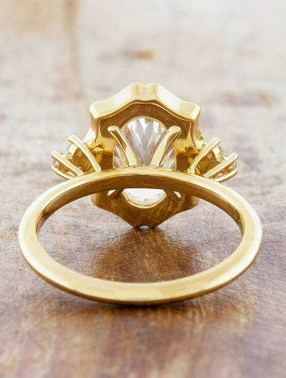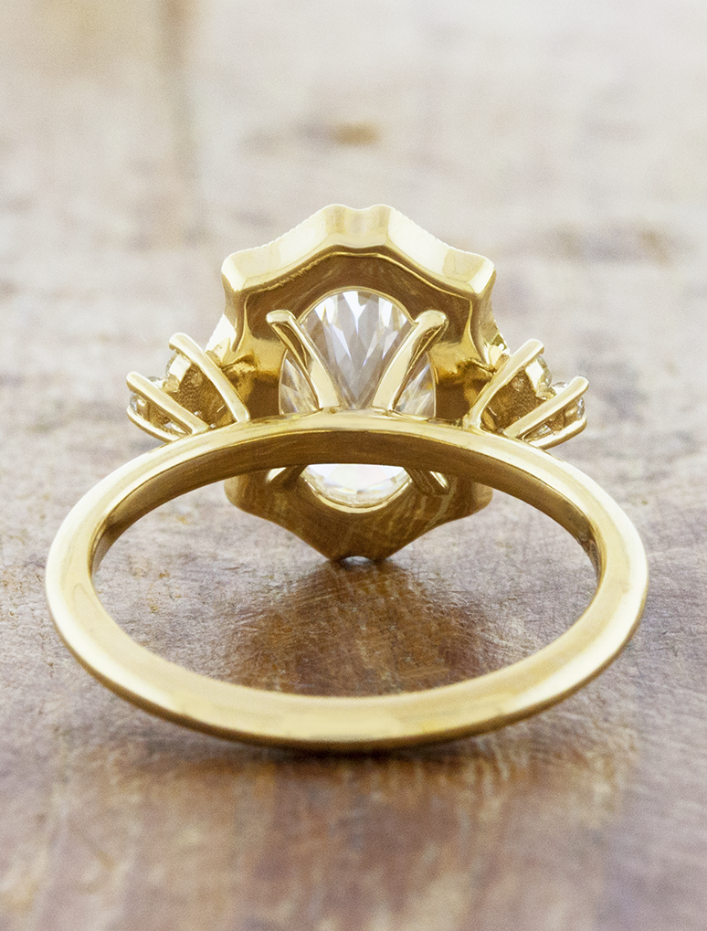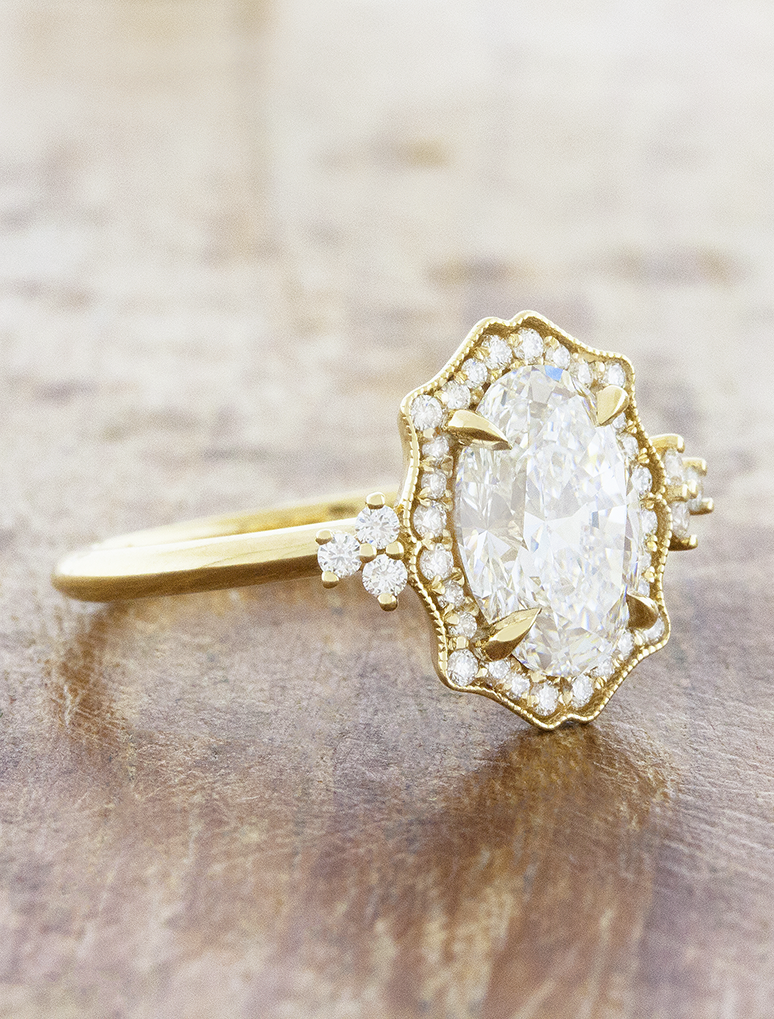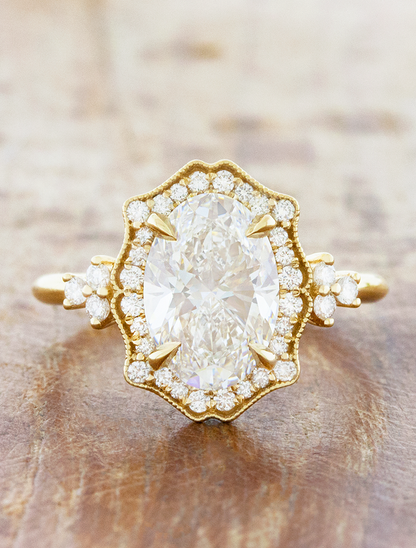 Evelina is a captivating blend of vintage elegance and intricate design. At her heart lies a brilliant oval diamond, gracefully framed by an ornate halo of shimmering diamonds and delicate milgrain detailing. On either side, trios of round-cut diamond clusters add a radiant touch.
