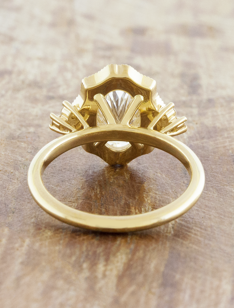 Evelina is a captivating blend of vintage elegance and intricacy, designed in 14k yellow gold. At her heart lies a brilliant 2.09ct E VVS2 oval diamond, gracefully framed by an ornate halo of shimmering diamonds and delicate milgrain detailing. On either side, trios of round-cut diamond clusters add a radiant touch.