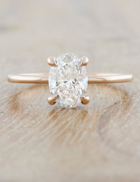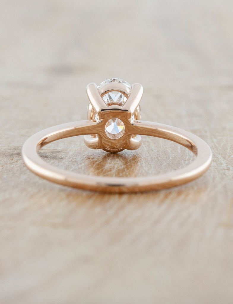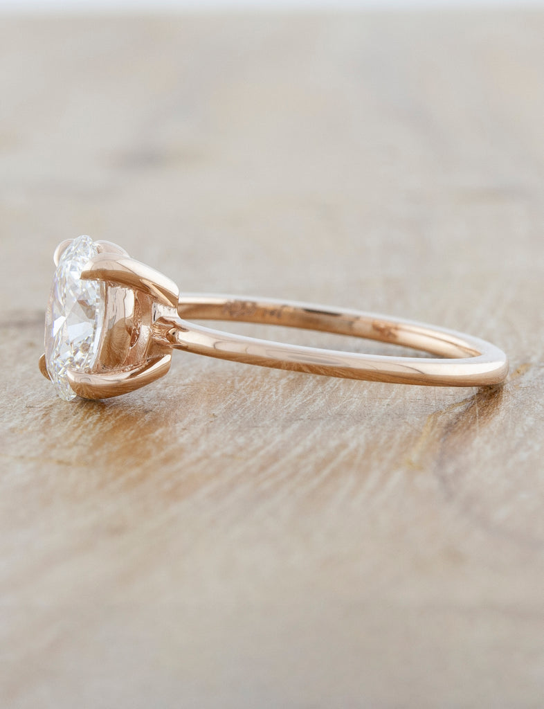 It is like a floating diamond ring.  Its thin, simple and a stone highlighter.  Huge look on this lab grown 1.00ct D VS1 brilliant oval cut diamond on a 14k rose gold setting.