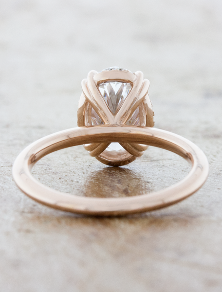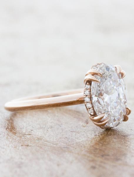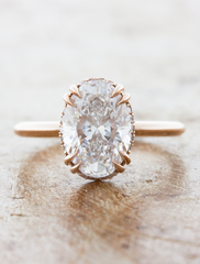 Isabella features a brilliant oval shaped conflict-free diamond sitting atop the band. In this design, the diamond is guarded by four handcrafted leaf-like prongs - a subtle tip of the hat to nature and the circle of life.  We then sprinkled some diamonds along the ring's gallery to give it extra sparkle and a peek-a-boo halo.  If you like the concept of this ring, but prefer more bling on the band, check out our Samanthina design.