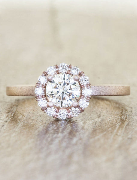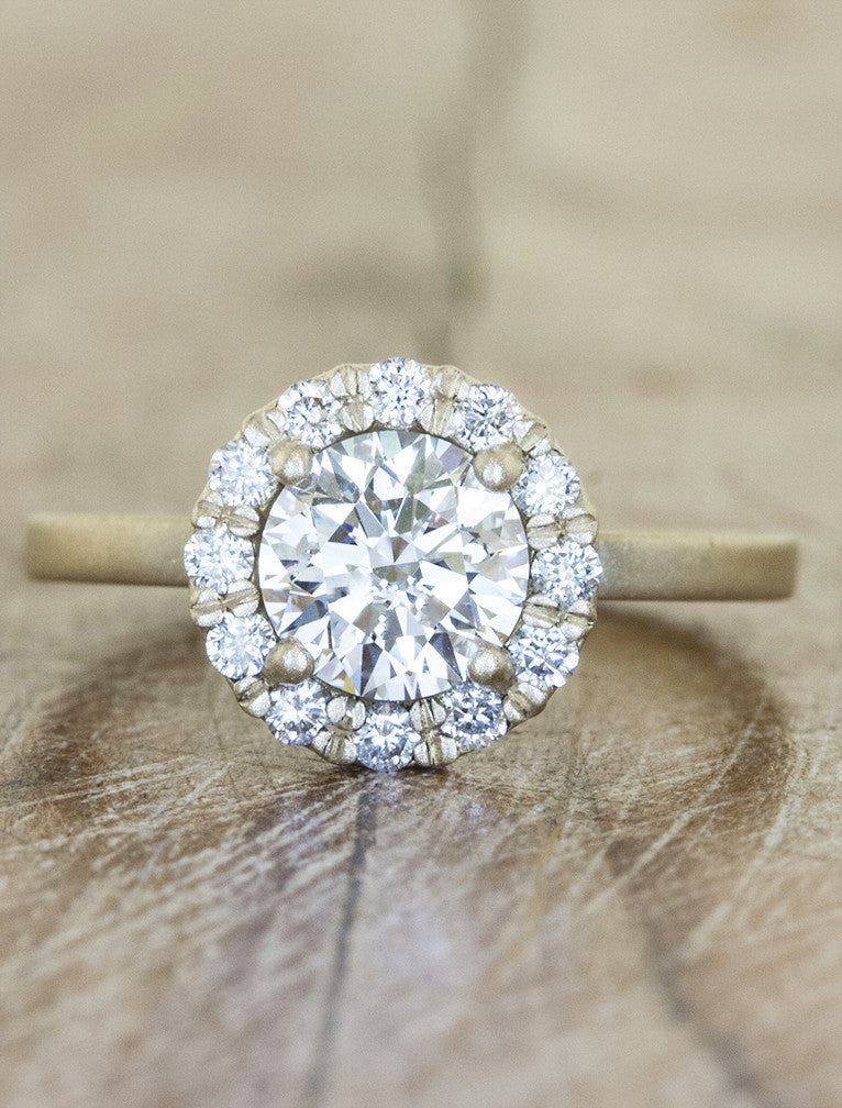 Aisling blends classic beauty with modern sophistication, showcasing a round diamond encircled by an elegant halo. Her flat band with a satin finish adds a contemporary edge to this timeless design.