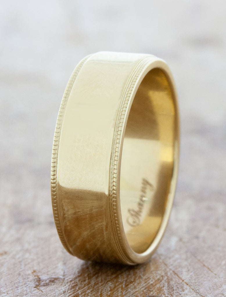 Hunter is smooth and sleek for the person who wants a timeless classic with a hint of vintage inspiration evident with its milgrain trim.  He is created in a comfortable, flat band that is 7mm in width.  Handmade in NYC.