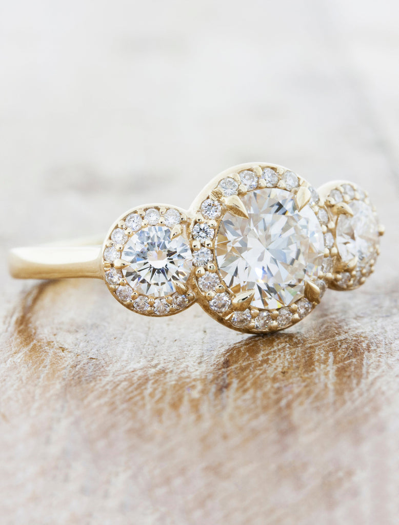 The Inolah engagement ring emanates classiness and refinement.  She features three sparkling round cut lab grown diamonds, each framed by a halo for a touch of glamour.  Her old world feel is fit for a queen and her three halos are the crown to prove it.