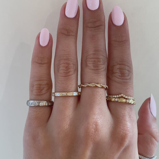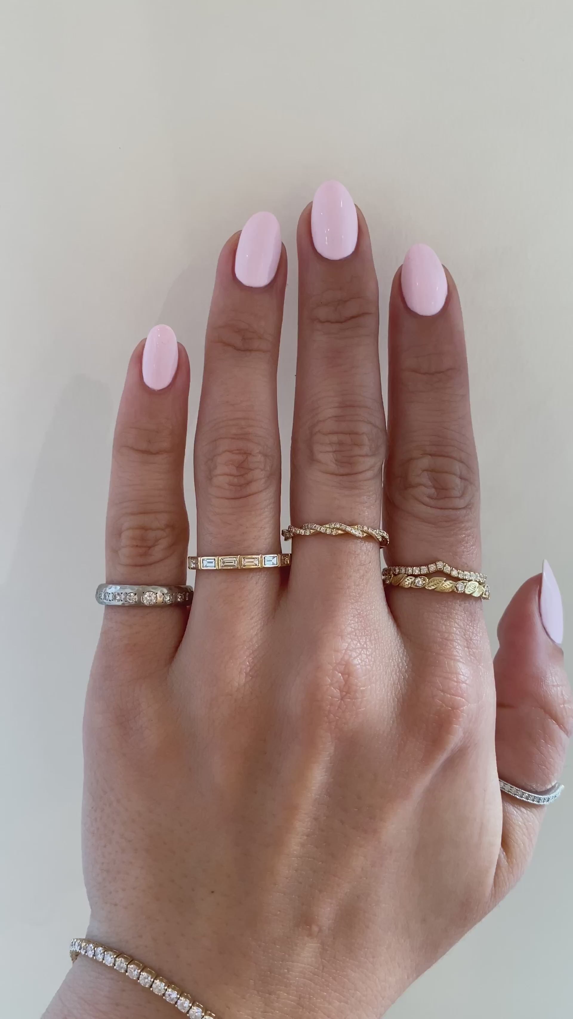 Ivory is a a sleek and sophisticated design that exudes timeless elegance. Featuring bezel-set baguette diamonds, each stone is gracefully framed, creating a seamless flow of brilliance 3/4 of the way around the band.