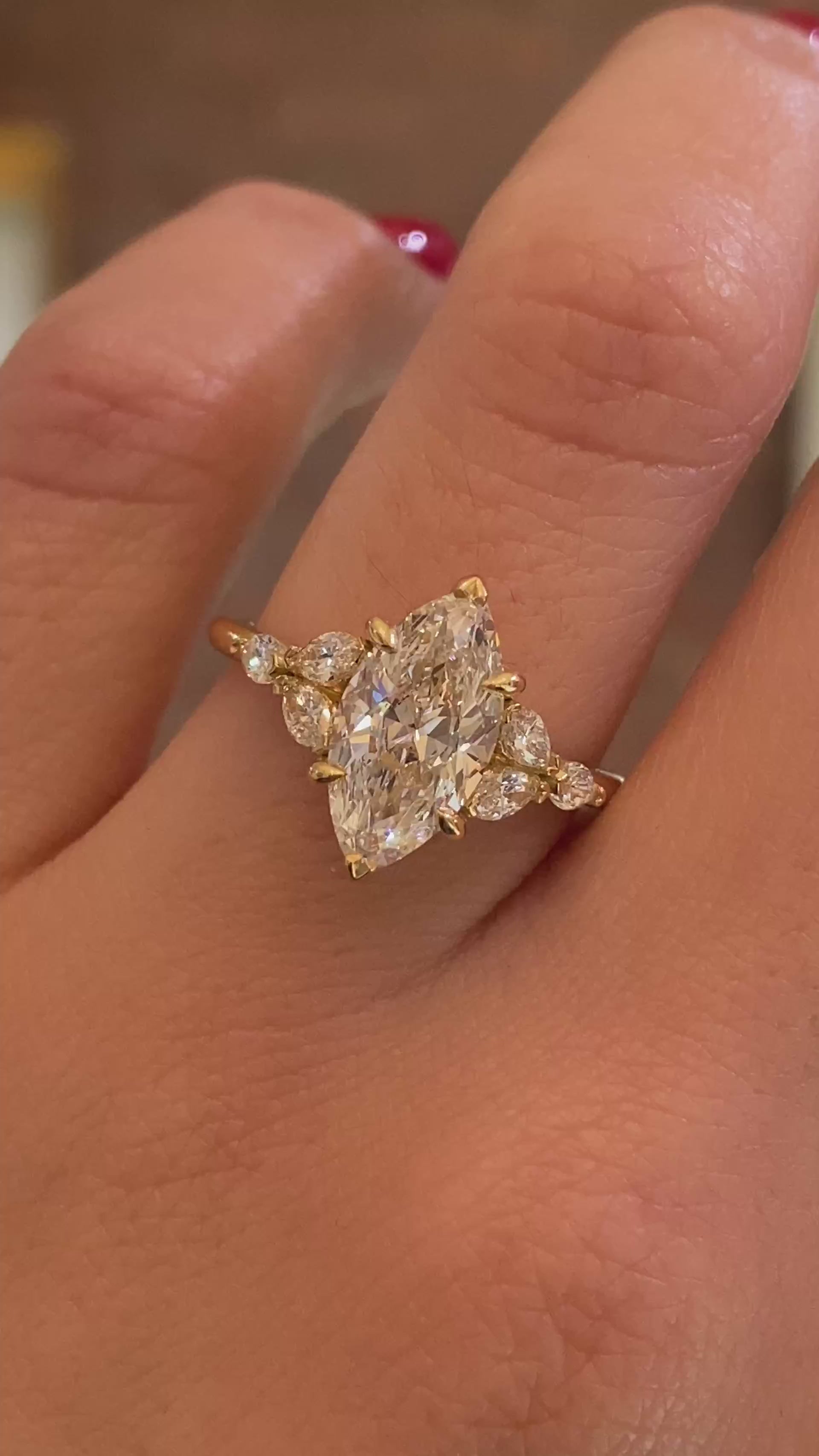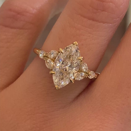Jacqueline is an exquisite celebration of love and elegance. At her heart, this captivating engagement ring features a marquise cut diamond. On either side, three marquise accent diamonds bloom like petals in perfect harmony, creating a seamless flow of brilliance and beauty within her cathedral setting.