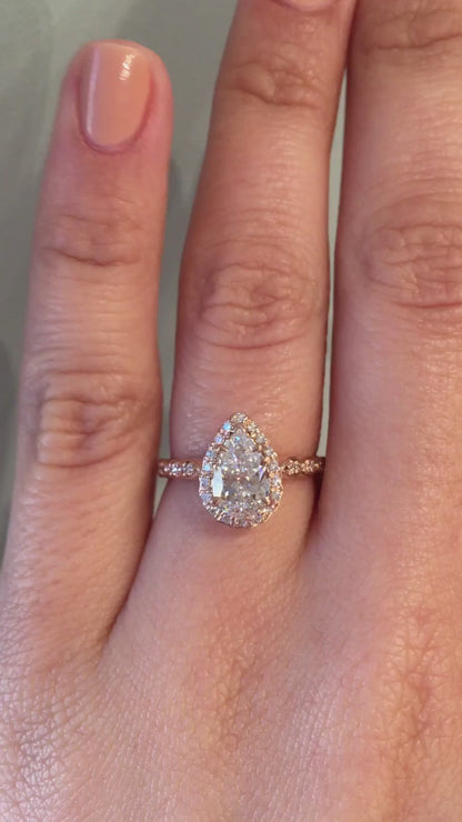 At the heart of our Jelissa lies a magnificent pear-shaped diamond. The pear cut is framed by brilliant round diamonds that enhance the stone's radiance, but also add a touch of glamour and sophistication to the ring.