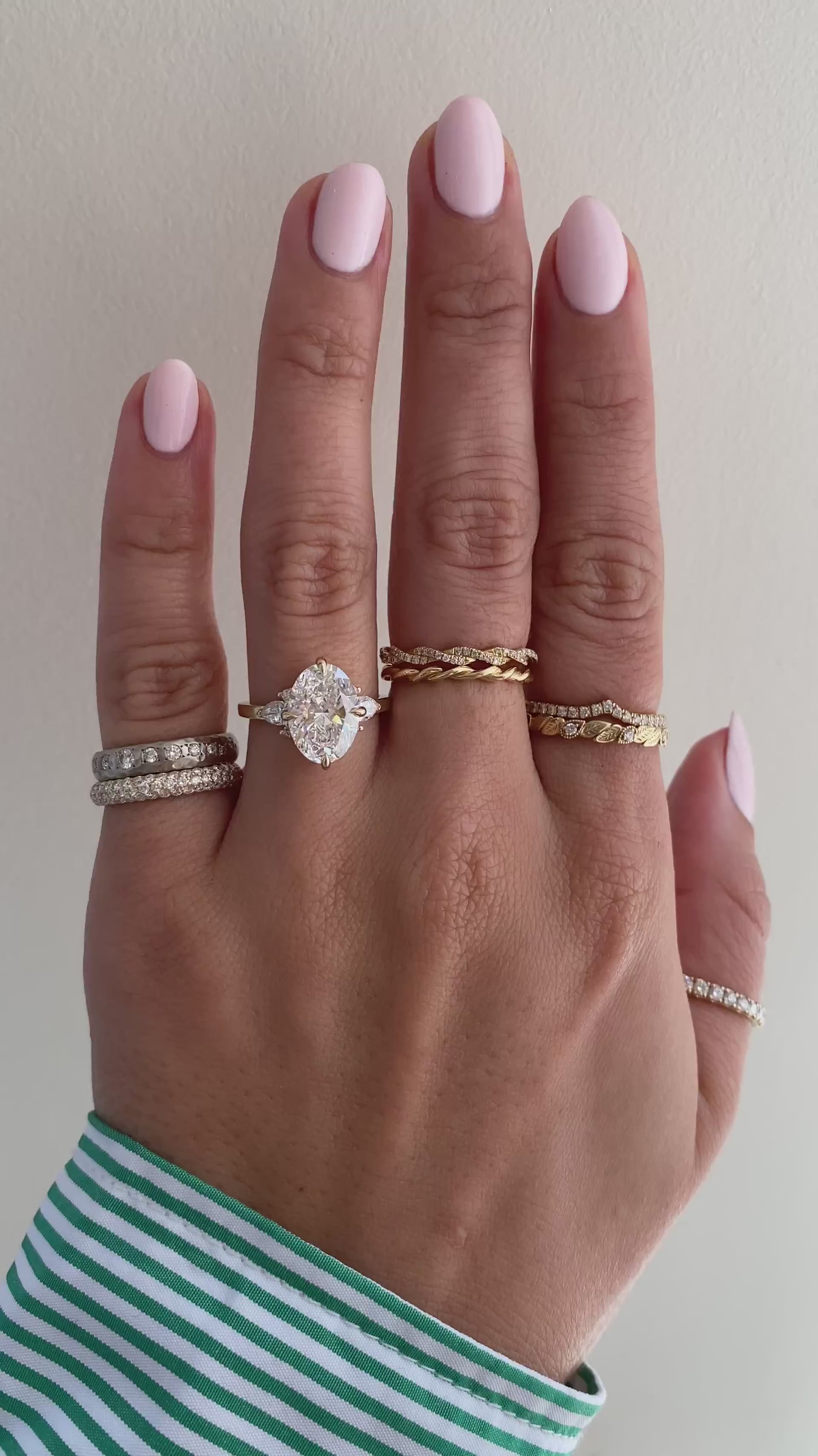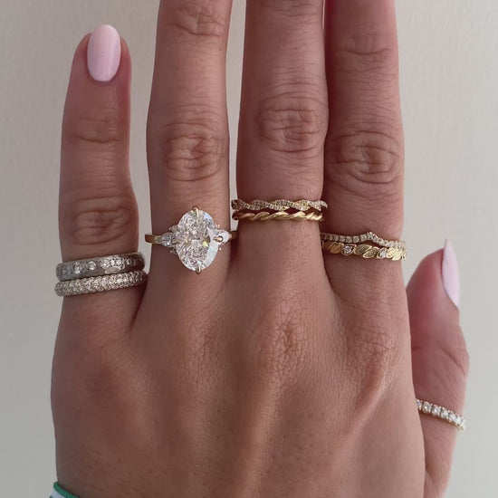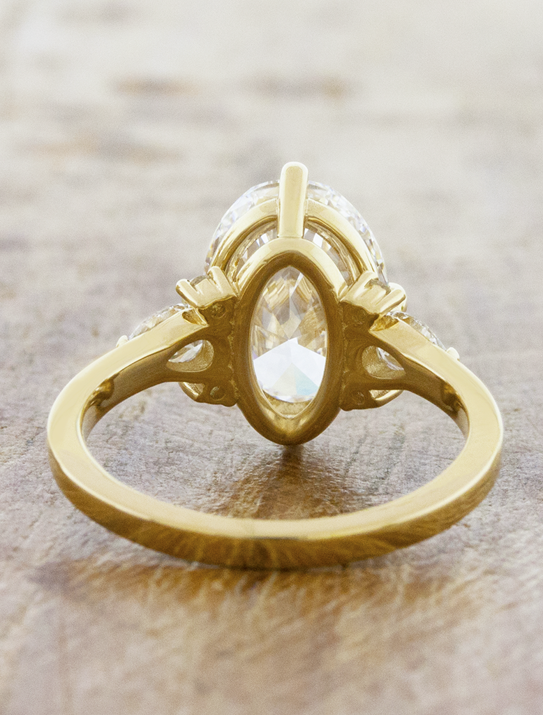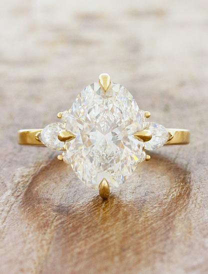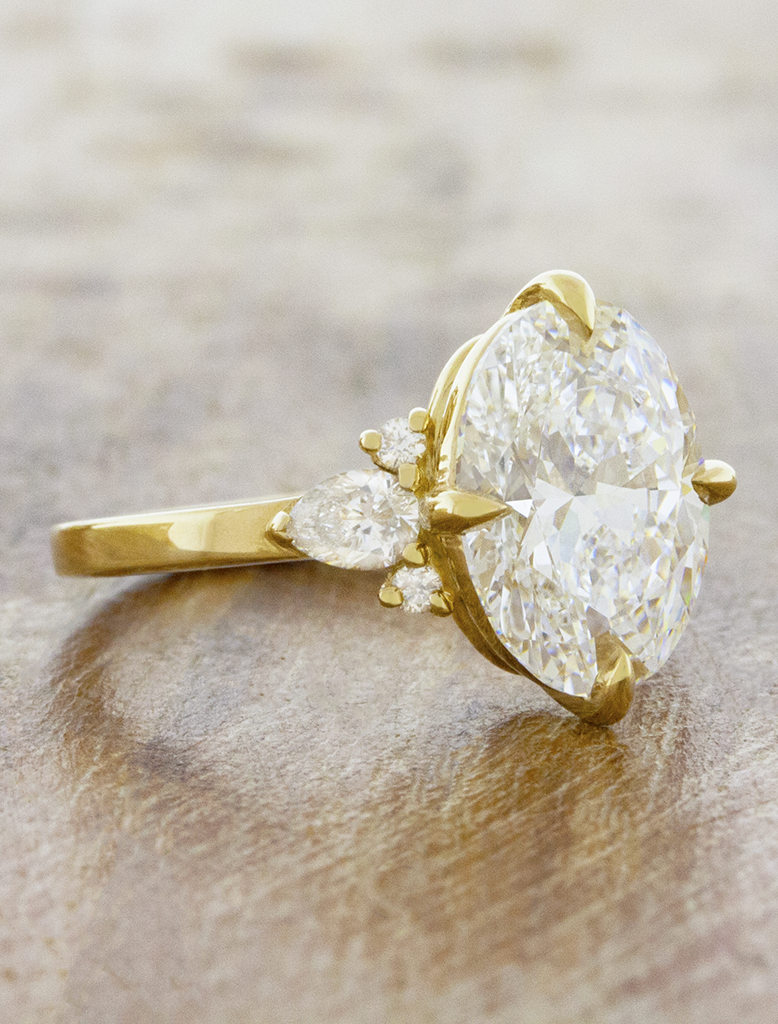 Jillian is a cluster of love and beauty throughout her vintage-inspired design. Her oval cut center stone is accompanied by two round cut accents and a pear diamond on either side. Her squared off band and compass set prongs add an element of contemporary flair.