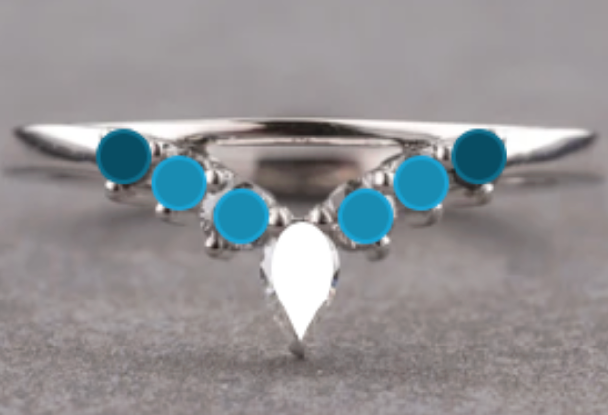 Design Details: Create ombre effect with teal sapphires as shown (center pear is colorless dia). Custom curve around engagement ring (#29922 to be sent in for sizing).