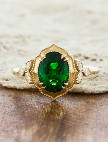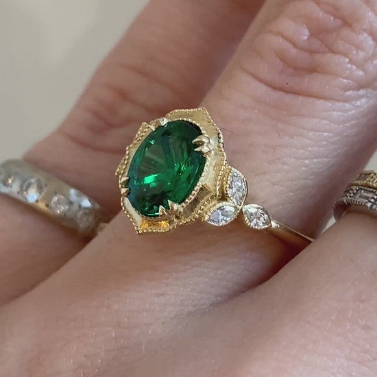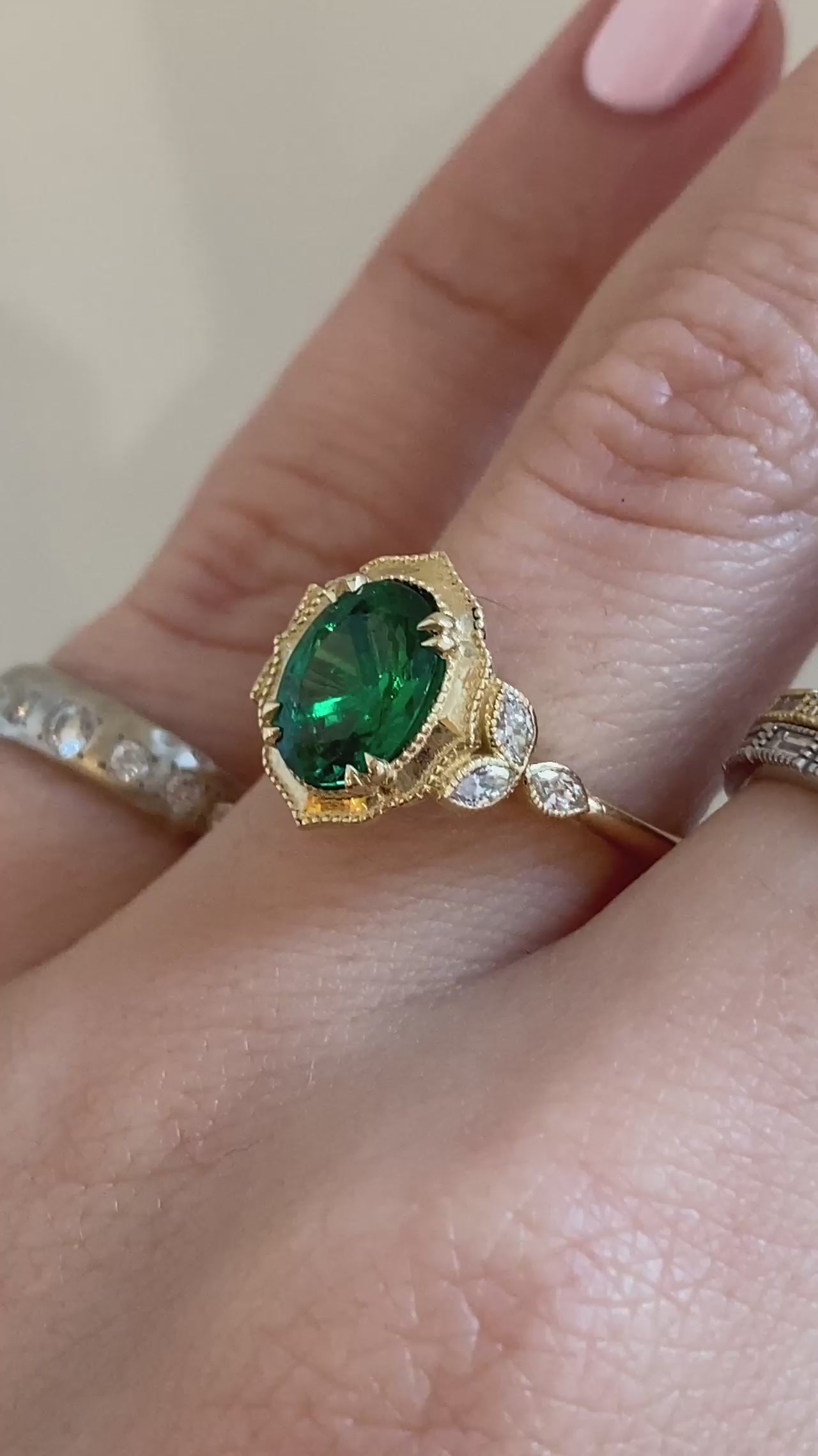 Judi is a romantic victorian style piece your partner will love. At her center is a vibrant oval cut green emerald surrounded by four double-claw prongs and intricate old world details. Her design is completed with a trio of marquise diamonds on either side. If you want a unique engagement ring with an old world feel, look no further.