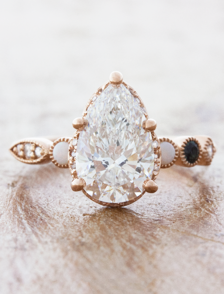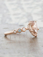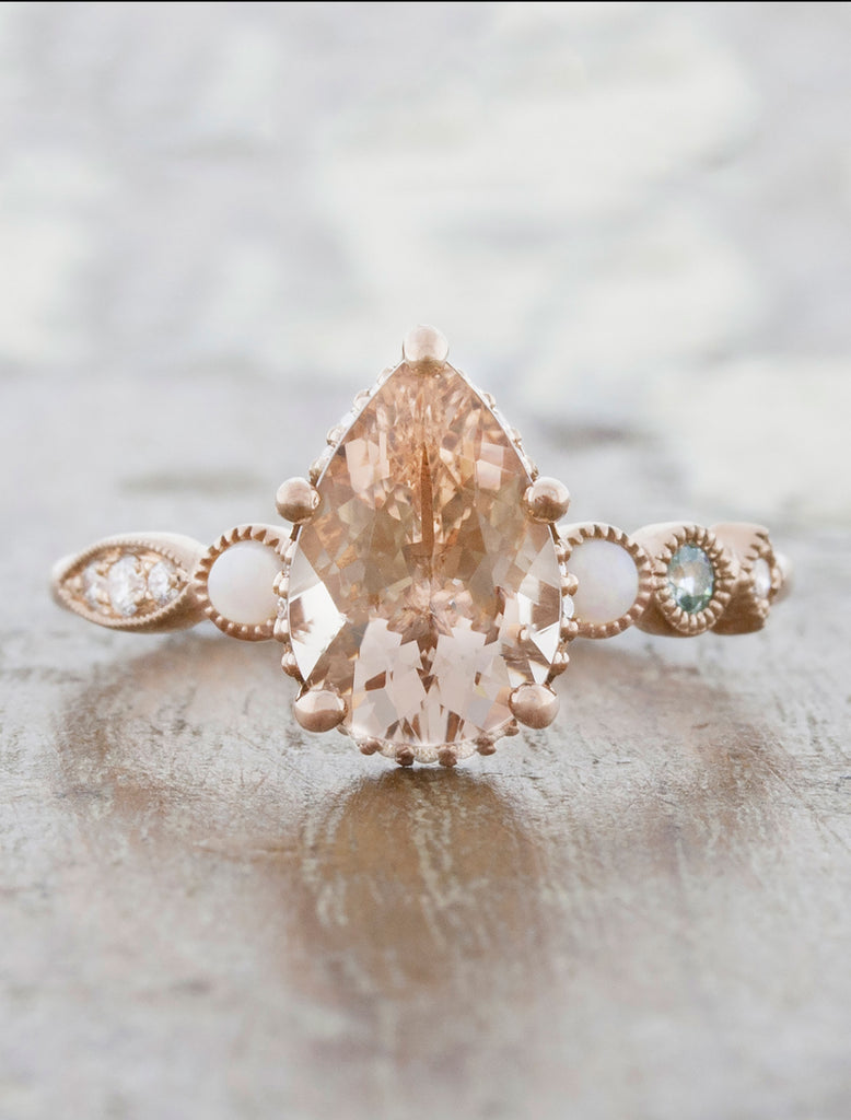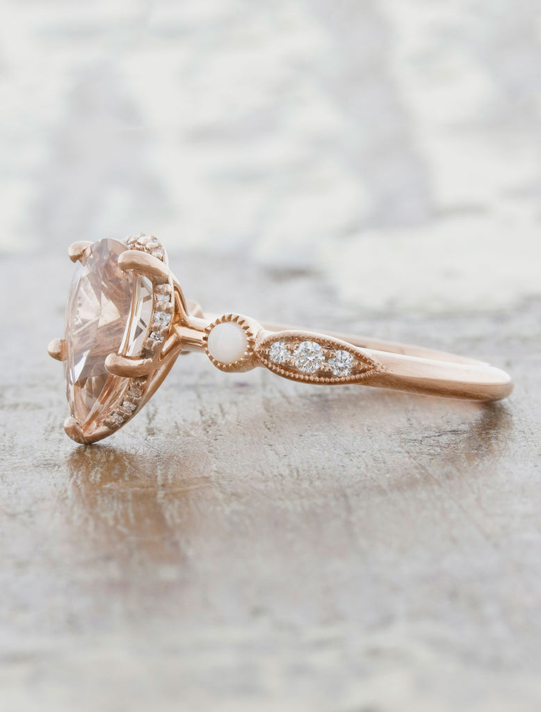 Kaipo is a delicate looking flower.  This design is an amazing example of vintage flare with its soft looking rose gold color and the very feminine opal and aquamarine side stones that glisten like the moon. Her pear center morganite that we sourced for our client is just one of the many fascinating aspects of this piece.  She is beyond words.